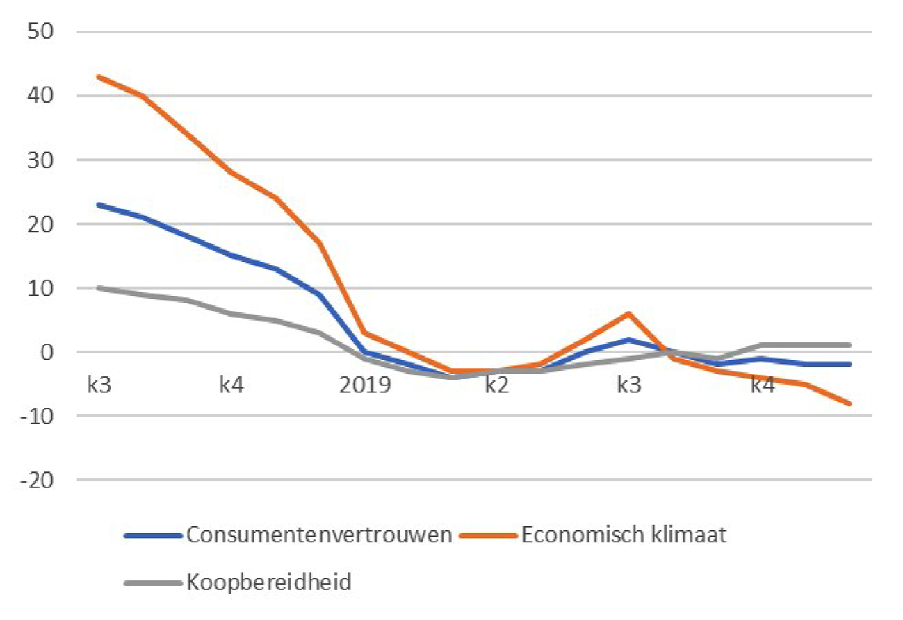 Het is niet mogelijk om de ontwikkeling van het consumentenvertrouwen precies te duiden. De verwachtingen van consumenten worden door veel factoren beïnvloed en zijn onder andere gevoelig voor berichtgeving over de economie en de ontwikkeling van de beurskoersen. Het consumentenvertrouwen daalde sterk in de tweede helft van 2018. Dit kwam met name door de afname van de verwachtingen over het economische klimaat, en houdt mogelijk verband met onzekerheden ten aanzien van de wereldhandel en brexit (in het VK, België en Ierland nam het consumentenvertrouwen ook af in deze periode). De daling aan het begin van 2019 heeft hier mogelijk ook mee te maken, maar ook binnenlandse factoren kunnen een rol hebben gespeeld zoals de verhoging van het lage btw-tarief. Zo nam het aandeel van de consumenten dat aangaf over de voorafgaande 12 maanden sterke prijsstijgingen te hebben ervaren toe van 23% in het 4e kwartaal van 2018 tot 38% in het 2e kwartaal van 2019.