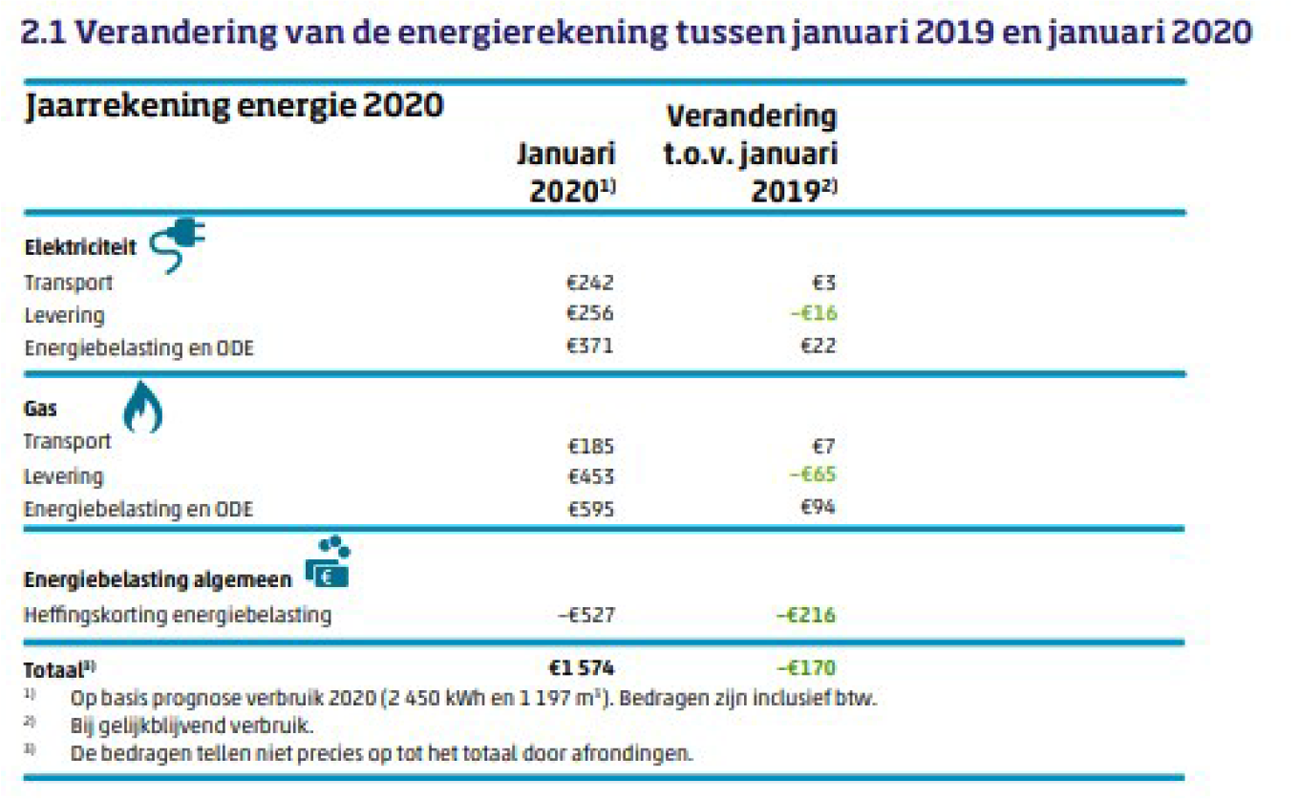 Het Centraal Bureau voor de Statistiek (CBS) heeft afgelopen maart, op basis van cijfers van het PBL, in de publicatie «huishoudens betalen bijna 10 procent minder voor energie» een recent inzicht gegeven in de gemiddelde energierekening in januari 2020 en de mutatie ten opzichte van januari 2019. Daarbij is onderscheid gemaakt tussen de verschillende componenten.