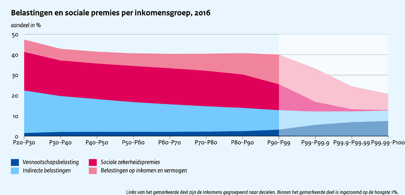 De totale belasting- en premieontvangsten over 2021 bedragen 322,3 miljard euro. Een uitsplitsing van dit gehele bedrag naar inkomensgroep is niet beschikbaar, omdat een groot deel van de belastingontvangsten niet direct naar natuurlijke personen te herleiden is. Denk hierbij aan de vennootschapsbelasting en de btw. Het CPB heeft in zijn recente studie «Ongelijkheid en herverdeling» de verdeling van alle belastinginkomsten in kaart gebracht voor 2016, waarbij deze belastingen wel zijn toegerekend aan natuurlijke personen. Onderstaande figuur toont de verdeling van belastingen in 2016 naar inkomensdeciel op huishoudensniveau. Voor 2021 is deze analyse niet beschikbaar.