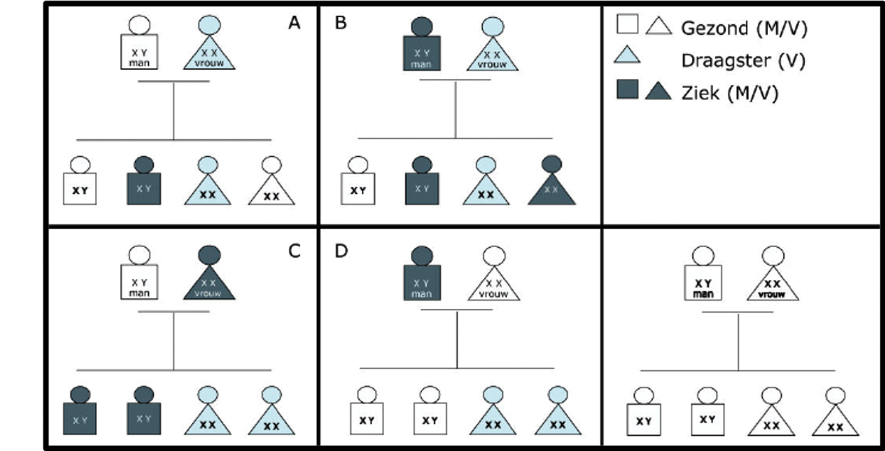 Een koppel wil graag kinderen. De man, Martijn, heeft Hemofilie A, een genetische aandoening waarbij het X-chromosoom is aangedaan. Hierdoor stolt het bloed minder goed wat ernstige impact heeft op het dagelijks leven van Martijn. Wanneer Hannah en Martijn een zoon zouden krijgen is deze gezond omdat hij het «gezonde» X-chromosoom van Hannah krijgt en het Y-chromosoom van Martijn. Maar wanneer Hannah en Martijn een dochter krijgen, is zij 100% zeker draagster. De dochter krijgt namelijk het «ongezonde» X-chromosoom van Martijn (zie overerveringsschema D).