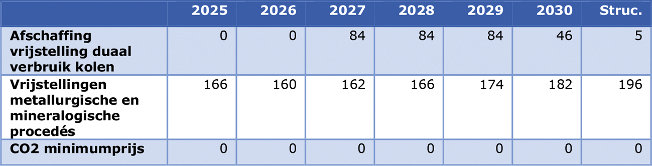 Het kabinet is op basis van de voornoemde motie een onderzoeksbureau aan het selecteren om de stapeling van maatregelen die de metallurgische en mineralogische sector raken in beeld te brengen. Daarbij zal het kabinet, zoals verzocht in de motie, additioneel beleid verkennen om het handelingsperspectief van de sector te verbeteren en het risico op weglek te verkleinen. Dit kan zowel fiscaal als niet-fiscaal beleid zijn. De resultaten van het onderzoek zullen in het tweede kwartaal 2024 naar de Tweede Kamer worden gezonden. Dit geeft het kabinet en de Tweede Kamer de mogelijkheid om in het Belastingplan 2025 of de begrotingen nog bij te sturen. Het kabinet vindt het zeer onverstandig om het wetsvoorstel pas te behandelen nadat de onderzoeksresultaten bekend zijn. Het voorliggende wetsvoorstel bevat ten eerste niet alleen een wijziging van de energiebelasting, maar ook het afschaffen van de vrijstelling duaal gebruik en productie van cokes in de kolenbelasting en een voorstel om het prijspad van de minimumprijs voor CO2-emissies voor zowel de elektriciteitssector als de industrie vanaf het jaar 2024 te verhogen. Ten tweede zou dit een aanzienlijk negatieve budgettaire impact hebben en daarmee een volgend kabinet met een tegenvaller confronteren. De opbrengsten van het wetsvoorstel zijn in tabel 1 weergegeven. Verder is in het amendement Erkens c.s. de budgettaire opbrengst van een jaar eerder afschaffen van de vrijstelling van de kolenbelasting ingezet in het totale lastenbeeld, inclusief een lastenverlichting voor burgers door de MKB-winstvrijstelling minder te verlagen.2 Het demissionair kabinet hecht er dus aan geen gat in de begroting voor een volgend kabinet achter te laten. Dat zou financieel niet prudent zijn.