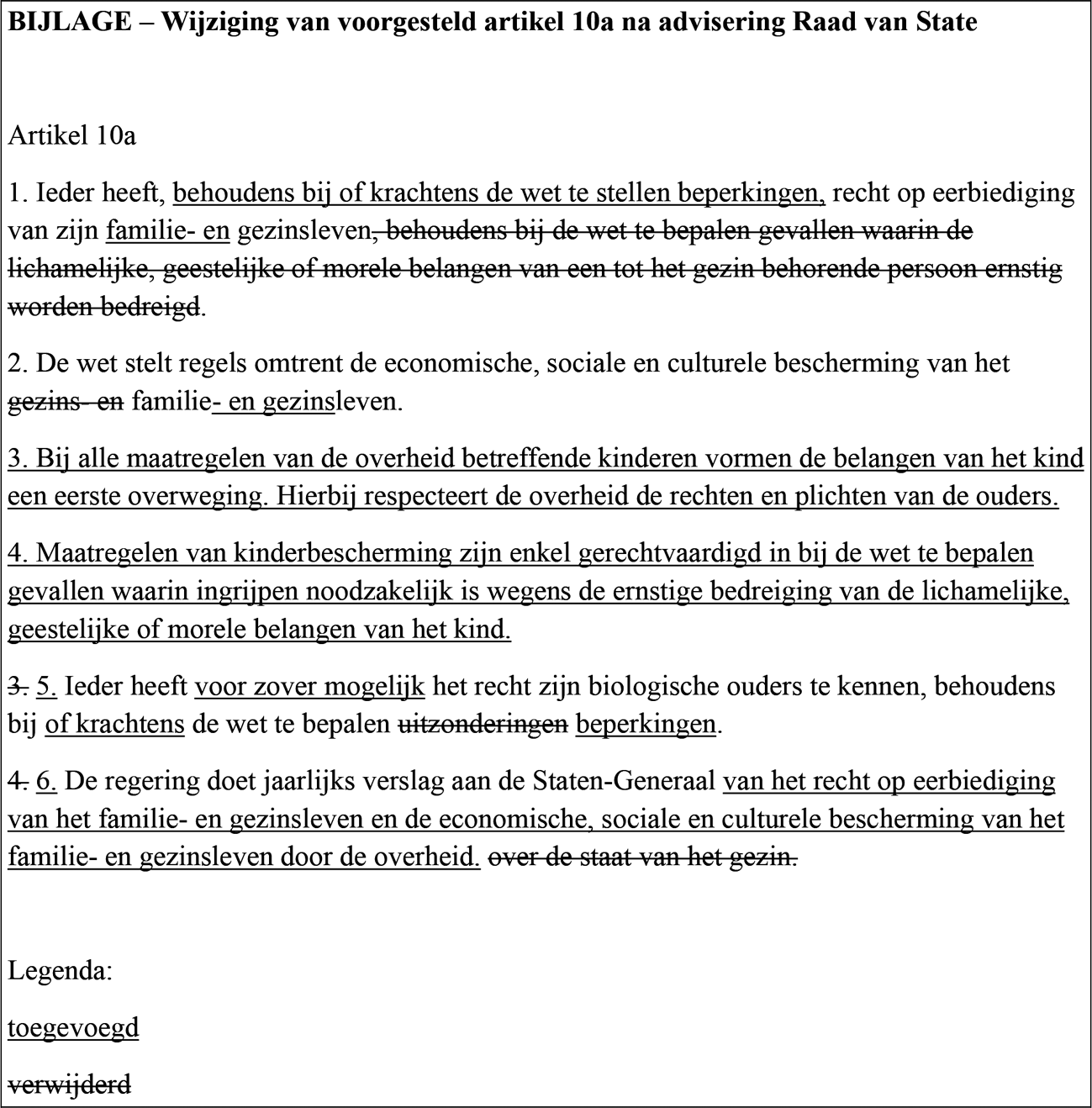 Naar aanleiding van het advies van de Raad van State hebben de initiatiefnemers het voorstel en de memorie van toelichting gewijzigd (zie de bijlage voor een weergave van de wijzigingen in het grondwetsartikel). De initiatiefnemers hebben verduidelijkt dat de gesignaleerde problemen in de kinderbescherming weliswaar de aanleiding vormden voor het wetsvoorstel, maar niet de enige reden. De Raad van State betwijfelde namelijk of verankering van het recht op eerbiediging van het gezins- en familieleven in de Grondwet daadwerkelijk bijdraagt aan de oplossing van deze problemen. De meerwaarde van het voorstel is volgens de initiatiefnemers gelegen in het feit dat de wetgever door een grondwettelijke regeling niet de ruimte heeft om wetgeving te versoepelen. Verder hebben de initiatiefnemers, zoals de Raad van State adviseerde, met de gewijzigde wettekst aangesloten bij de tekst van artikel 8 Europees Verdrag voor de Rechten van de Mens (EVRM) en spreekt deze nu van «familie- en gezinsleven». Ook hebben zij in de toelichting verduidelijkt niet de bedoeling te hebben dit begrip smal uit te leggen en de lijn in de jurisprudentie van het EHRM te ondersteunen. Daarbij wordt op basis van materiële, feitelijke criteria beoordeeld of sprake is van familie- en gezinsleven. Tot slot hebben de initiatiefnemers het advies van de Raad van State verwerkt door met de bepaling over het recht de biologische ouders te kennen, beter aan te sluiten bij het Verdrag inzake de rechten van het kind (IVRK) en het delegatieverbod daarin te schrappen.