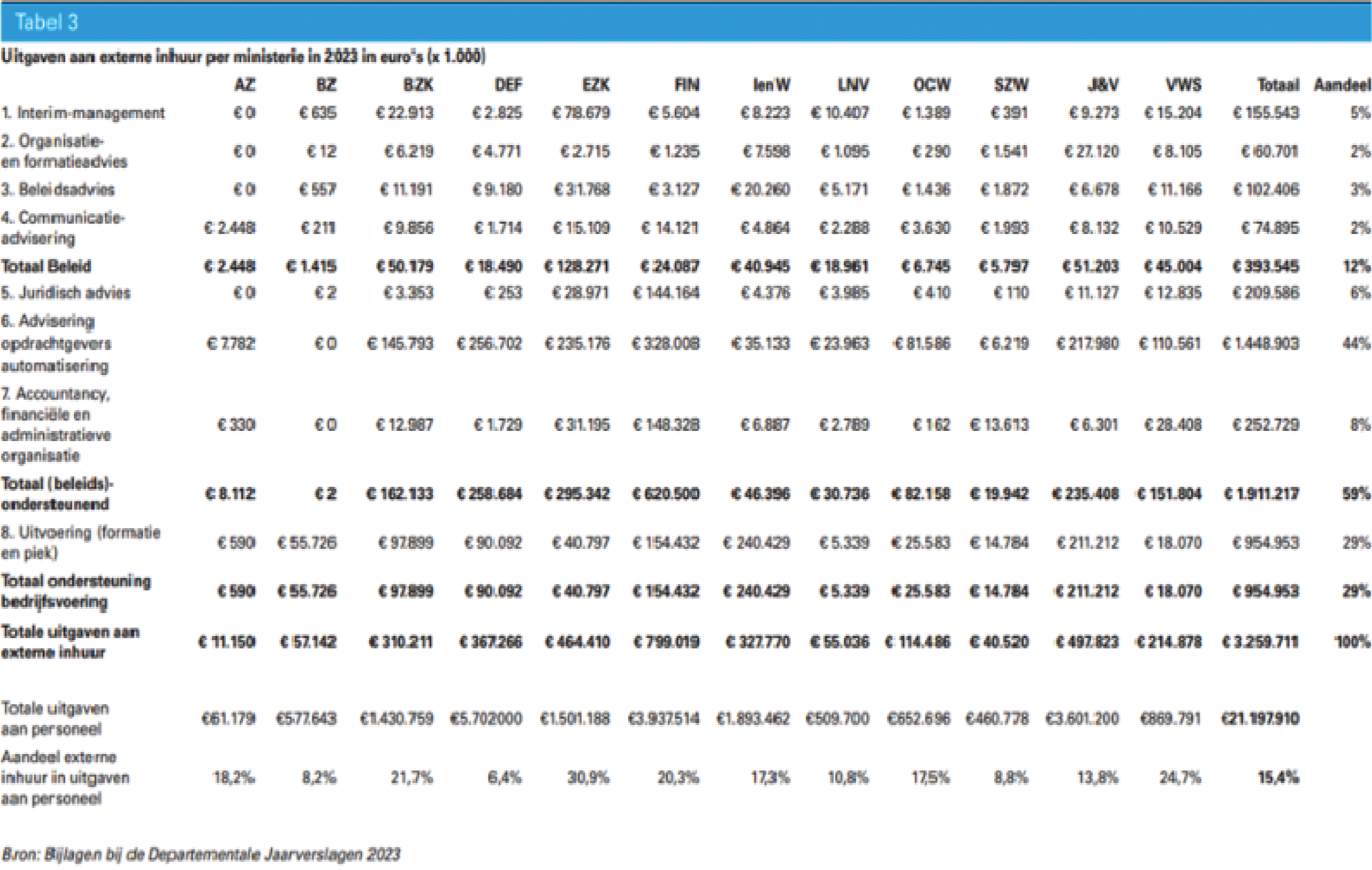 In de tabel op de volgende pagina is aangegeven welke bedragen per departement en per inhuurcategorie aan externe inhuur worden uitgegeven. De externe inhuur wordt weergegeven in geld en niet in fte’s.