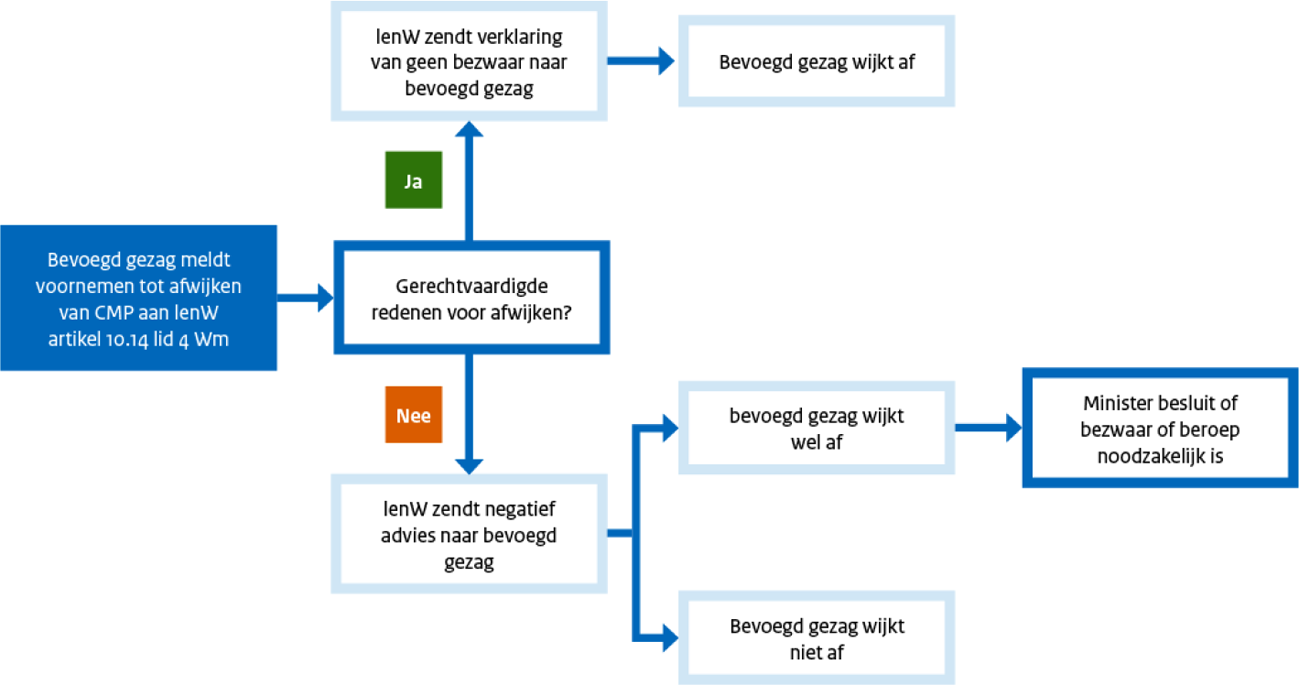 Er is sprake van afwijken als bestuursorganen bij het nemen van besluiten of bij het formuleren van beleid of het opstellen van plannen en verordeningen zich niet houden aan de bepalingen uit het CMP. In de Wm ligt vast dat bestuursorganen de Minister van IenW moeten informeren als ze bij deze taken of bevoegdheden van het CMP af willen wijken (artikel 10.14 lid 4 Wm).