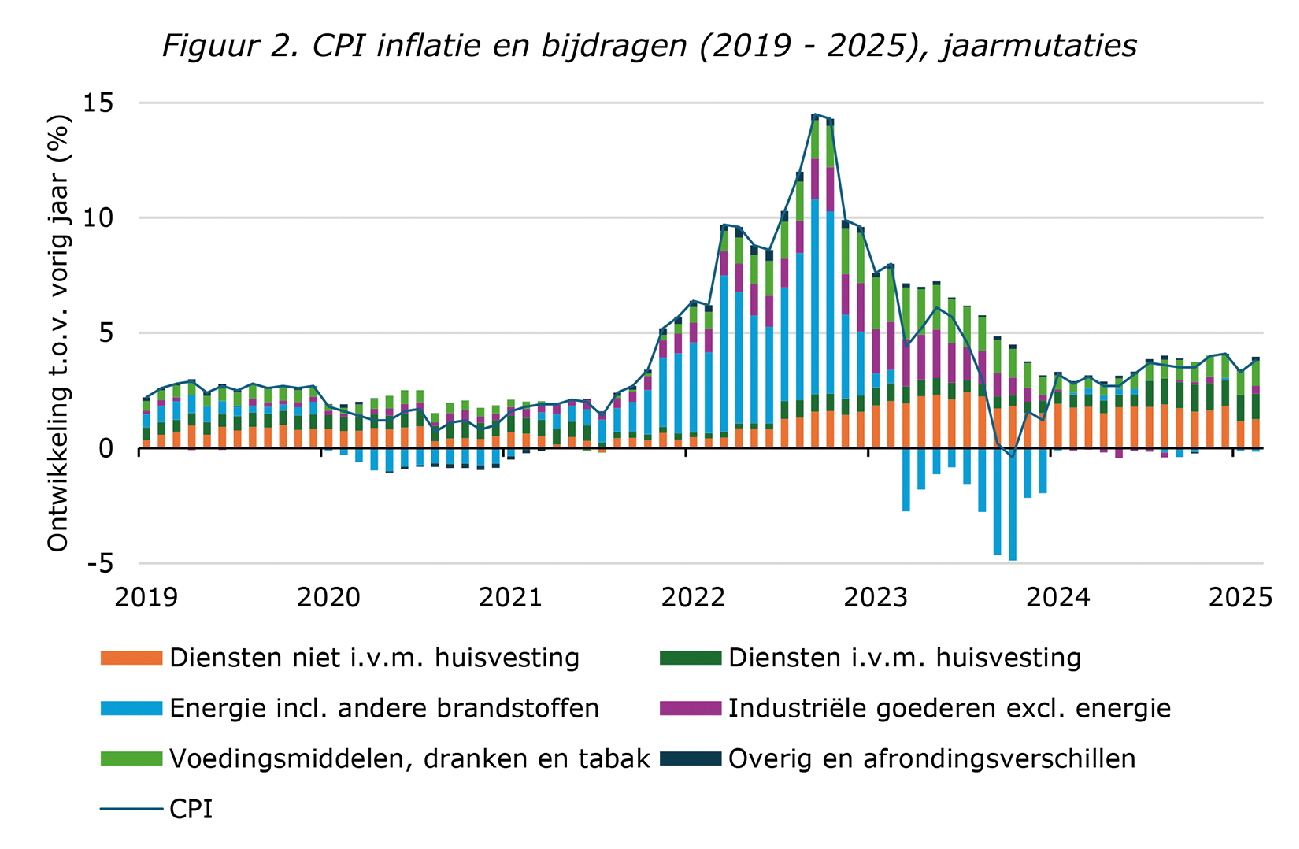 Figuur 2 illustreert het verloop van de Nederlandse inflatie (CPI, zie box 1 voor het verschil met de Europees geharmoniseerde HICP) naar de verschillende bijdragen van energie, goederen, diensten en voedsel tussen 2019 en 2025. De energieprijzen verklaarden verreweg het grootste deel van de stijgende inflatie in 2022 en dempten de inflatie in 2023, mede door het energieprijsplafond en energiebesparingen.2 Na de forse energieprijsschok bleef de inflatie hoger dan ervoor, doordat de doorwerking van de hogere energieprijzen op andere prijzen en lonen met een vertraging de inflatie omhoog duwt. De doorwerking van lagere energieprijzen naar overige prijzen heeft ook tijd nodig. Zo rekenen ondernemers de gestegen productiekosten van bijvoorbeeld energie en transport nog door in hun prijzen. Dat is te zien aan de groeiende bijdrage van onder meer industriële goederen en voeding in de inflatie in 2023. Daarnaast reageren lonen vertraagd op de inflatie door de systematiek van cao-onderhandelingen. Deze inhaalgroei van de lonen gaat gepaard met de groeiende bijdrage van de diensteninflatie in de totale inflatie sinds 2024. Hierdoor werkt de eerdere inflatieschok voor meerdere jaren door in de economie. Dit is een bekend fenomeen. Uit internationaal onderzoek blijkt dat landen na een snelle sterke stijging van de inflatie doorgaans te maken hebben met een langere periode van verhoogde inflatie.3