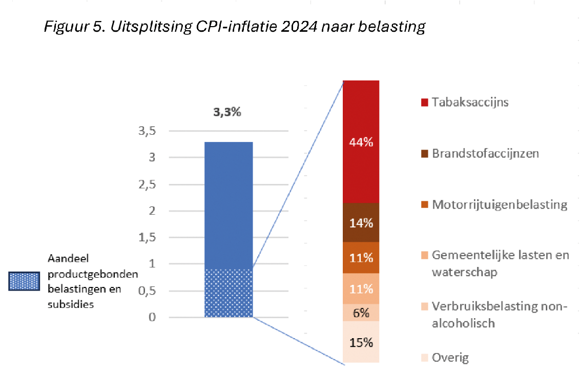 In figuur 5 is de bijdrage van productgebonden belastingen en subsidies aan de inflatie in 2024 uitgesplitst. De verhoging van de accijns op tabak heeft het grootste effect gehad. Daarnaast is te zien dat ook brandstofaccijnzen hebben bijgedragen. De bijdrage van de brandstofaccijnzen is geen gevolg van hogere belastingen in 2024 (die zijn gelijk gebleven), maar een statistisch effect. Halverwege 2023 is namelijk besloten om de verlaging van de brandstofaccijns gedeeltelijk terug te draaien. Het effect op de prijzen hiervan heeft zich al in 2023 gemanifesteerd maar doordat het jaargemiddelde in 2023 lager ligt dan in 2024 loopt dit over in het inflatiecijfer van 2024.