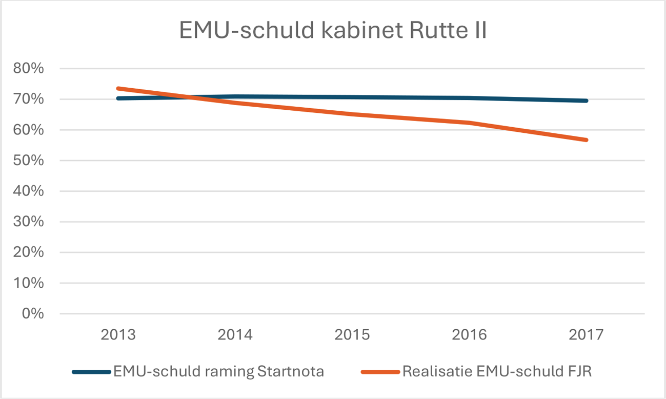 De prognose was dat de EMU-schuld ongeveer gelijk zou blijven. In werkelijkheid daalde die behoorlijk snel en was die 13 procentpunt van het BBP lager. Dat is ongeveer 90 miljard euro in 2017.