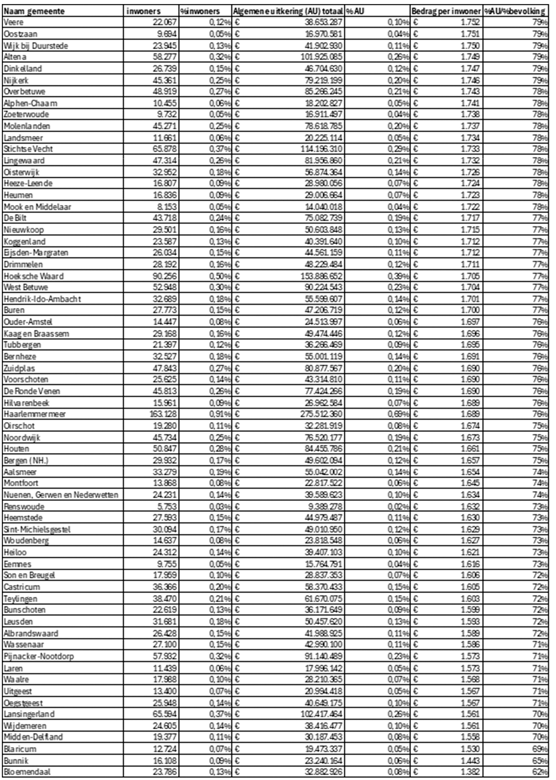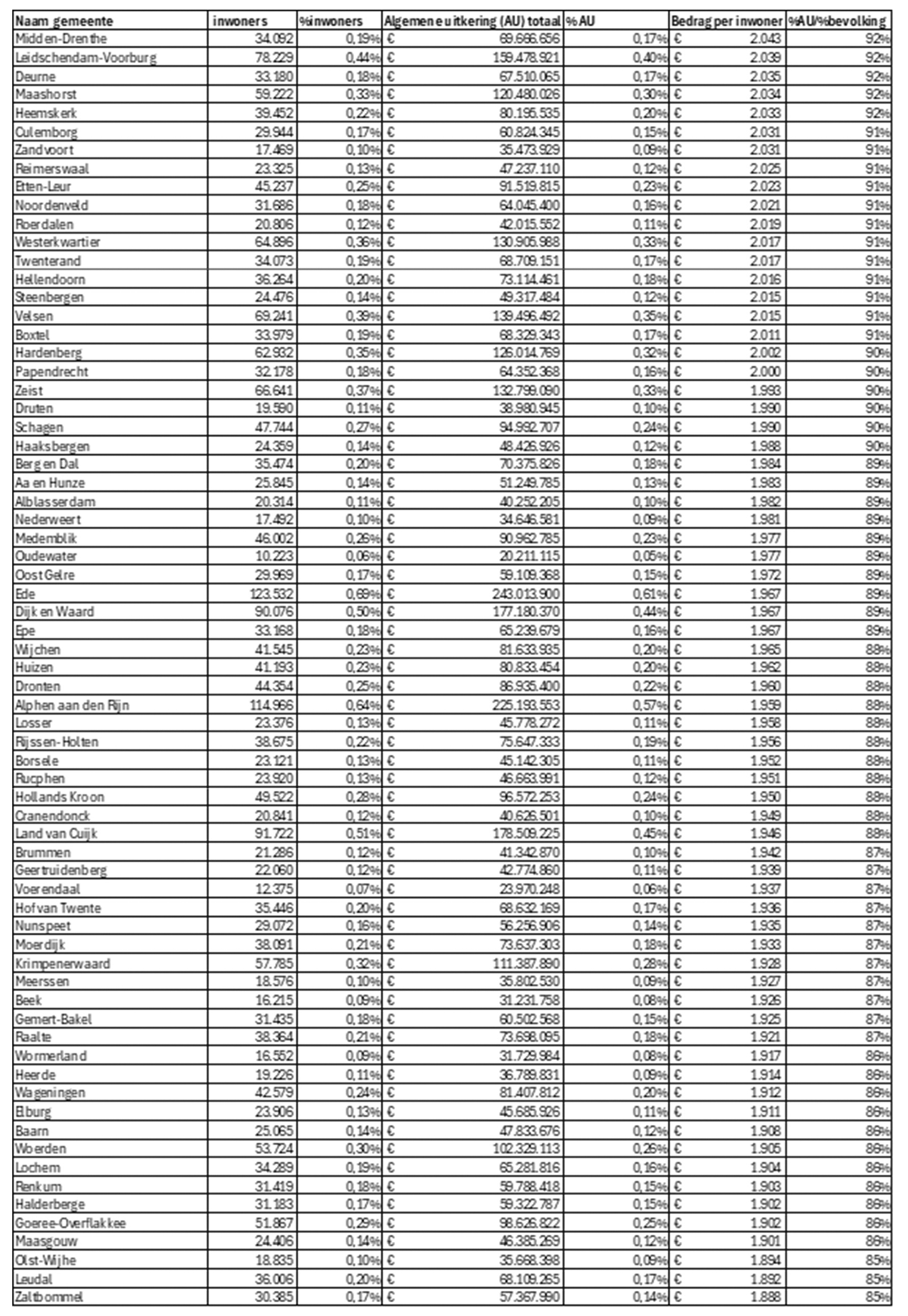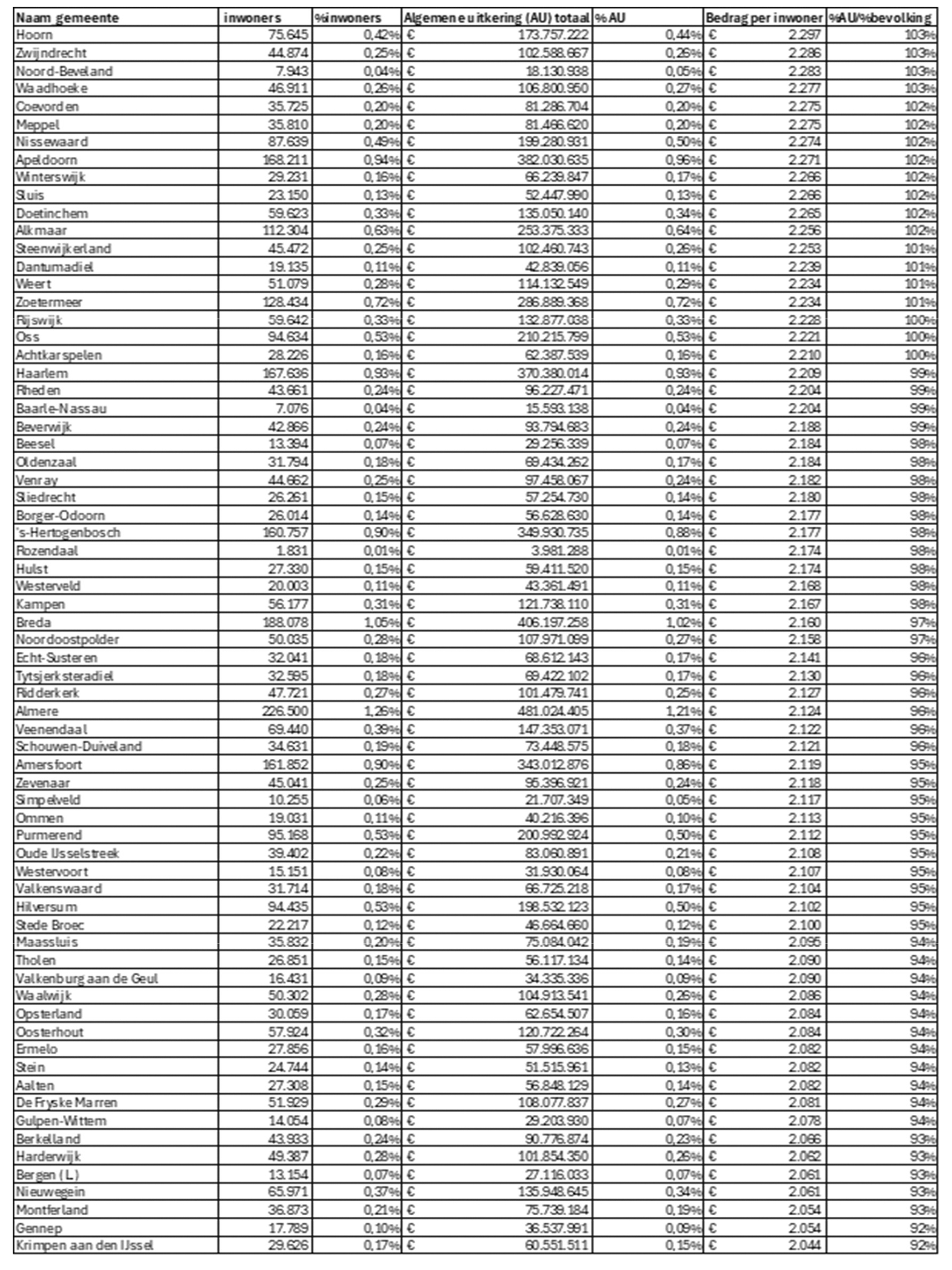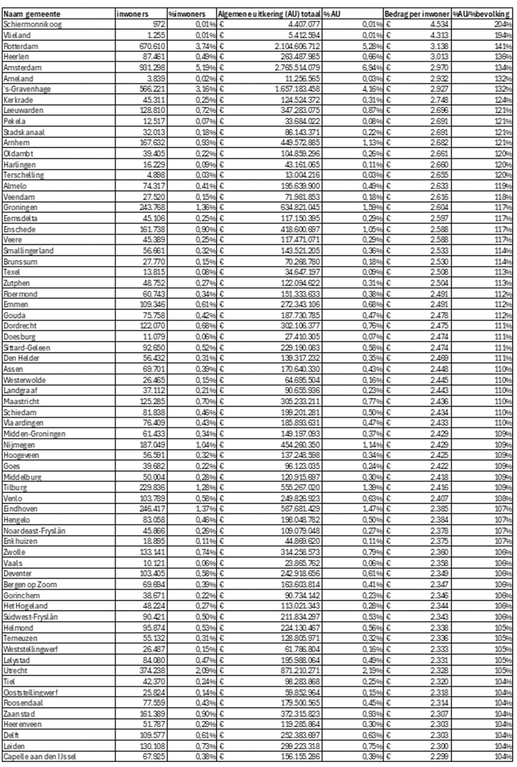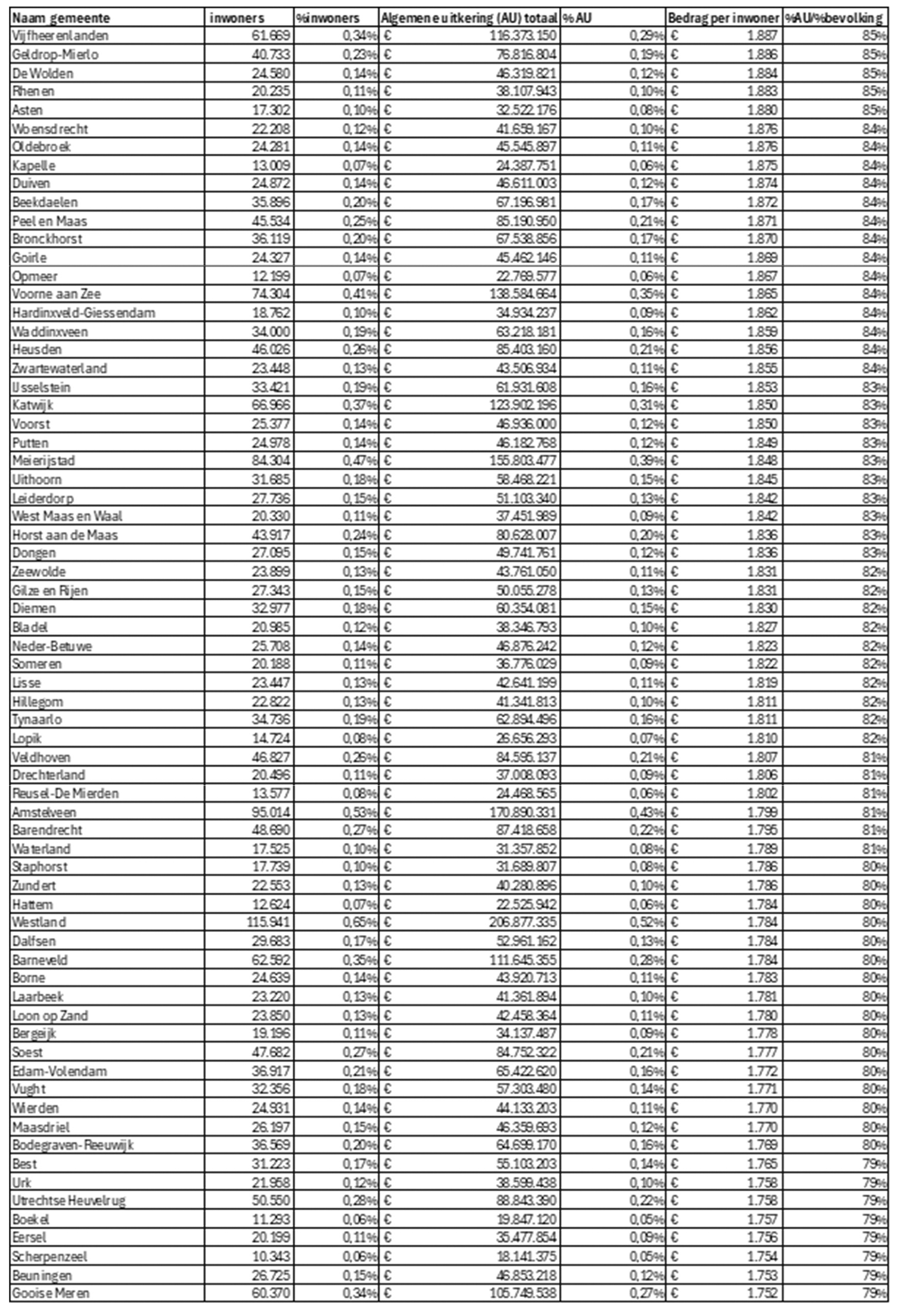 Kunt u per gemeente aangeven hoeveel zij, afgezet tegen het inwonersaantal, percentueel krijgen van de totale som?