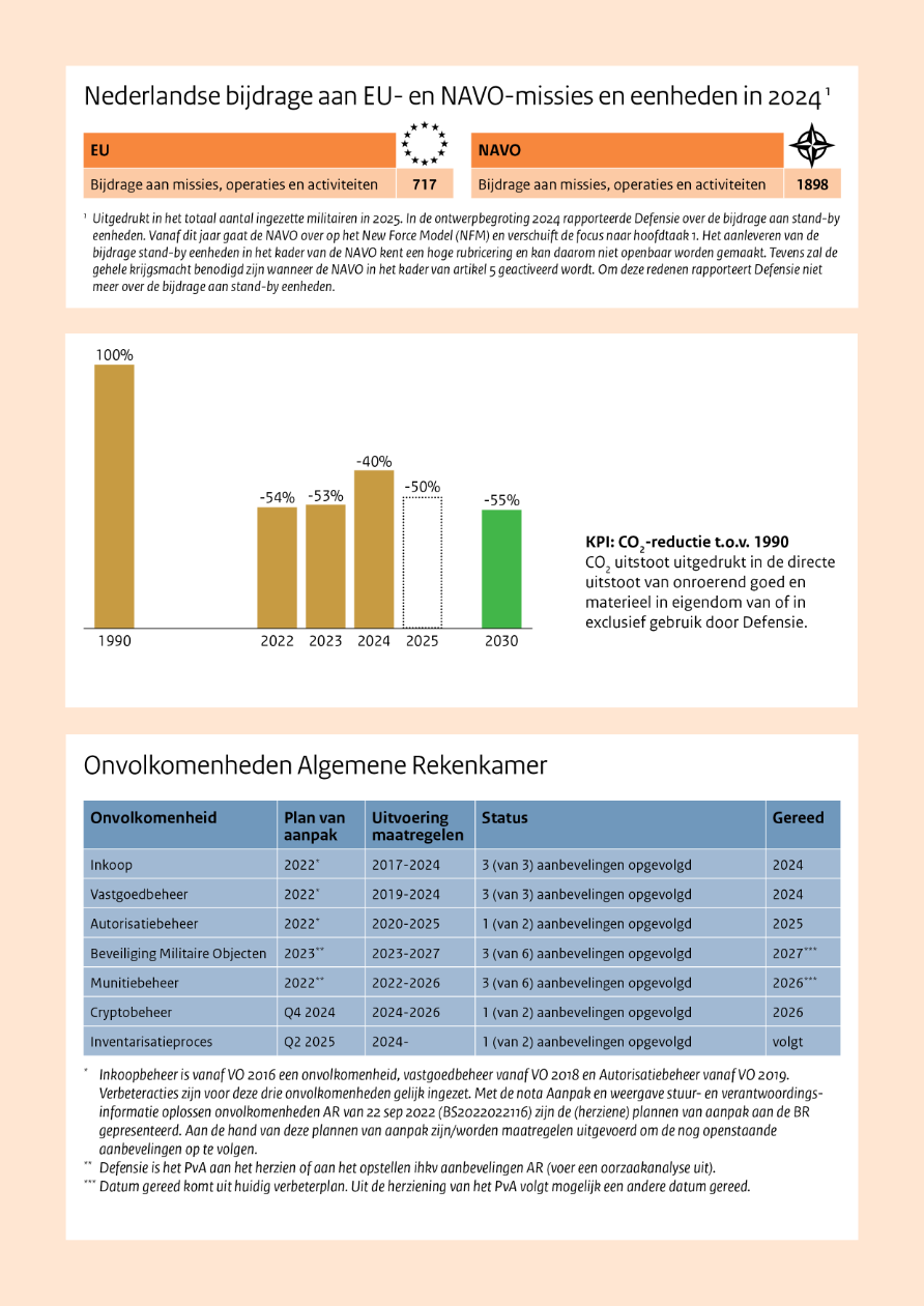 Het kabinet-Schoof heeft geïnvesteerd in het verhogen van de defensie-uitgaven. De defensie-uitgaven zijn in absolute zin ten opzichte van 2023 met ruim € 4,5 miljard gestegen naar 20 miljard en ook de in 2024 aangegane verplichtingen zijn gestegen van € 20 miljard naar € 30 miljard, ondanks het feit dat de realisatie van verplichtingen en de daaraan verbonden uitgaven onder druk staat als gevolg van de verhoging van budgetten van alle bondgenoten en de zeer krappe defensiematerieelmarkten en arbeidsmarkt. Deze krapte heeft ertoe geleid dat enkele investeringen in 2024 vertraagd zijn. Defensie heeft als gevolg van deze vertragingen in 2024 een deel van de defensie-uitgaven verschoven naar latere jaren. De extra middelen die het kabinet aan Defensie beschikbaar heeft gesteld, worden dan ook verspreid over de komende jaren uitgegeven. Ondanks deze externe marktkrapte lukt het Defensie om in budgettaire omvang in korte tijd snel te groeien. Dit toont niet alleen de ambitie van Defensie, maar ook het aanpassings- en groeivermogen van de organisatie.