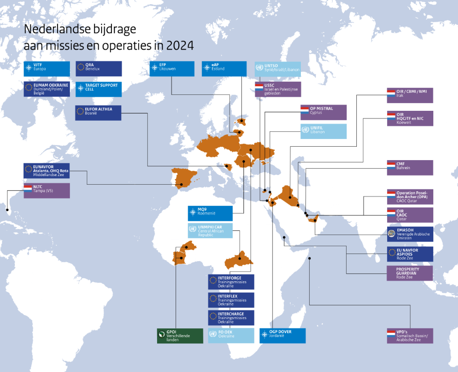 Nederland nam in 2024 deel aan vijf EU missies en operaties, waaronder EUFOR Althea, de Militaire Assistentie Missie (EUMAM) voor Oekraïne en EUNAFOR ASPIDES. In NAVO verband was Nederland in 2024 actief in verschillende missies, waaronder NATO Mission Iraq (NMI), enhanced Forward Presence (eFP), enhanced Vigilance Activities (eVA) en verschillende vlootverbanden.