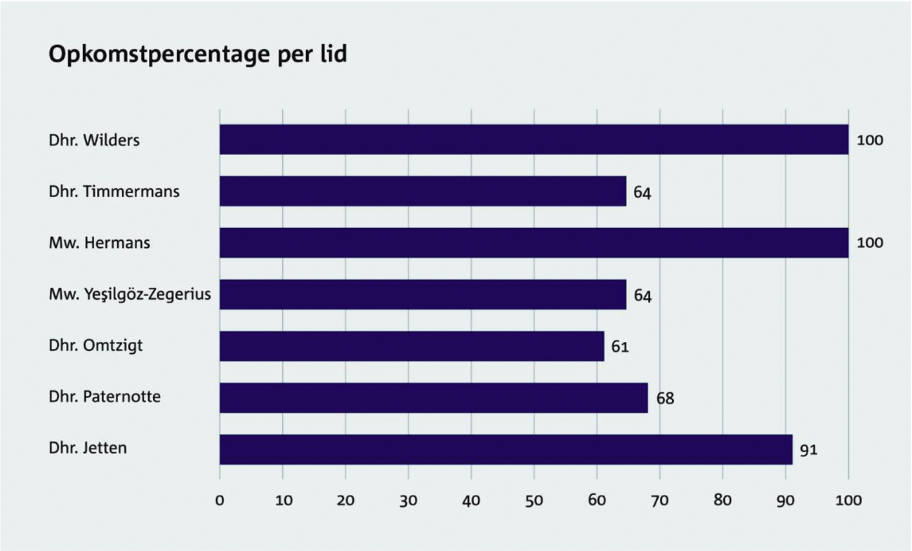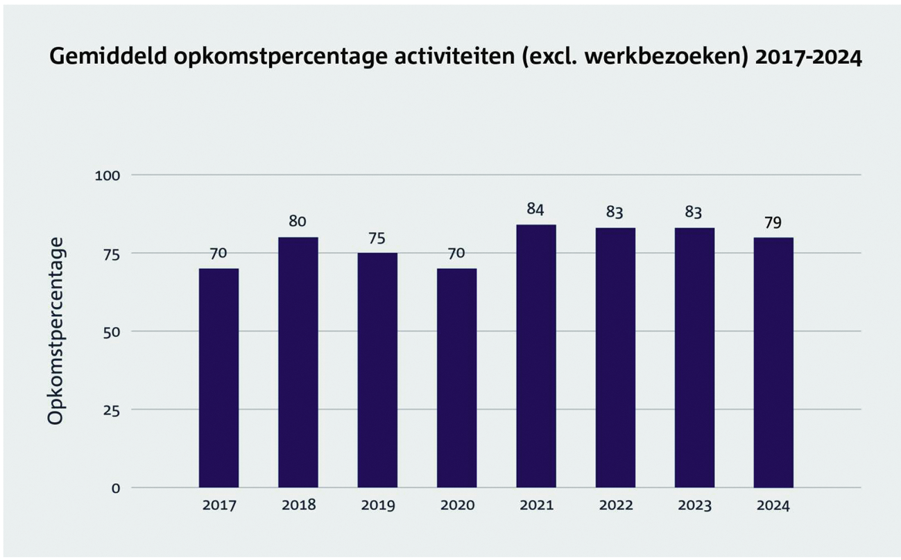 In 2024 kwam de commissie 35 keer bijeen voor een vergadering en legde zij één werkbezoek af. Dit zijn minder activiteiten dan in 2023. Vanwege de formatie besloot de commissie verdiepende activiteiten niet te plannen, in afwachting van de definitieve commissiesamenstelling na de formatie. De gemiddelde opkomst van de commissieleden lag in 2024 op 78%, inclusief werkbezoeken. Exclusief werkbezoeken lag het percentage op 79%.