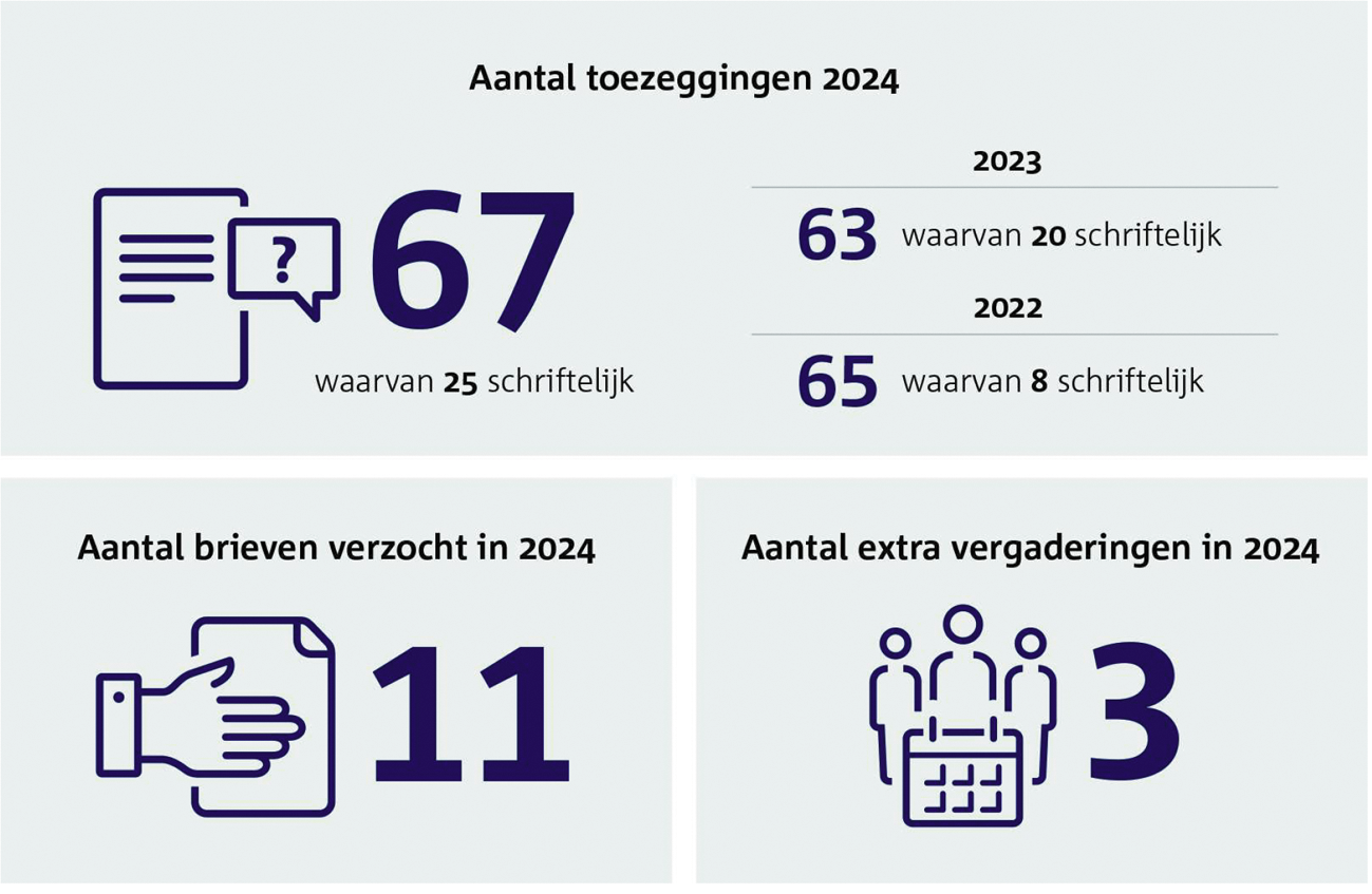 De commissie heeft in de loop van 2024 afgesproken dat toezeggingen voortaan schriftelijk dienen te worden afgedaan, tenzij de commissie besluit dat een mondelinge afdoening volstaat.