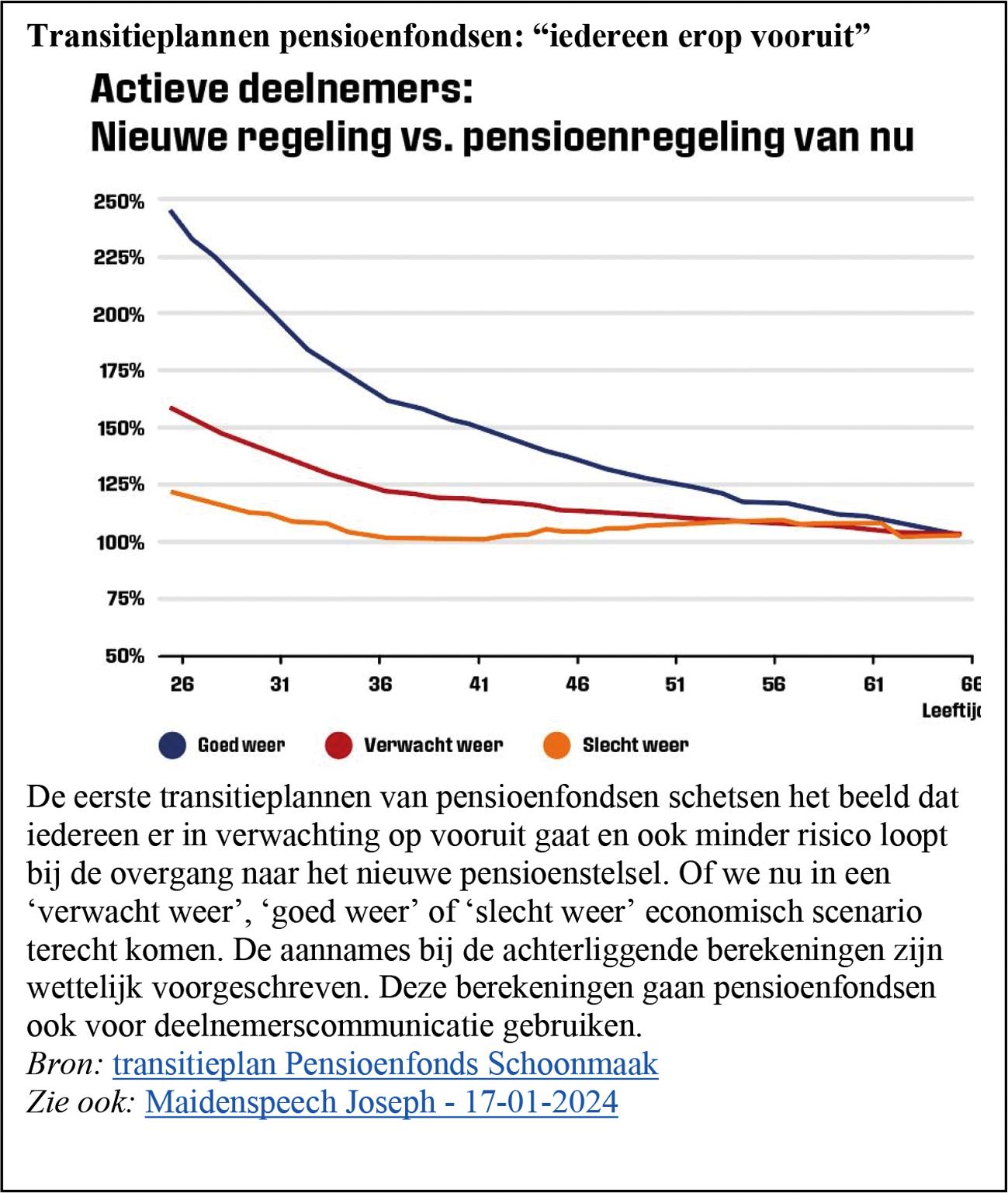 − «Bij de afschaffing van de doorsneesystematiek verwacht het fonds geen grote compensatieproblemen. Door de lage nominale opbouw en de lage rente vallen de te compenseren bedragen mee. «Er is een groep, rond 45–55, die wel tot 10% geraakt wordt, maar het compensatiebedrag schatten we nu op € 25 mln.» Dat is overzichtelijk voor een fonds van € 12 mrd.»