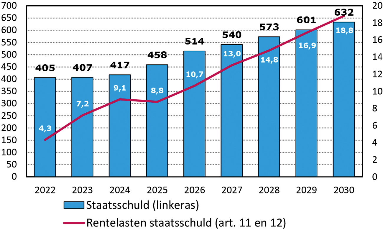 In de onderstaande grafiek is figuur 8 uit de ontwerpbegroting uitgebreid met de jaren 2027–2030.