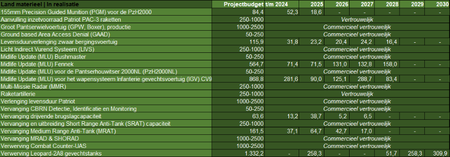 Defensie werkt onverminderd door aan de realisatie van het investeringsprogramma voor materieelprojecten, digitalisering en infrastructuur. In lijn met de Defensienota 2024 wordt aanvullend geïnvesteerd in lucht- en raketverdediging, voortzettingsvermogen en versnelde realisatieplannen. Waar mogelijk versnelt Defensie projecten die nodig zijn voor de prioriteit hoofdtaak 1, het beschermen van het Nederlandse grondgebied en dat van onze bondgenoten. Versnelling is nodig door de veranderde internationale verhoudingen. Defensie zal prioriteiten moeten stellen en versnellen. We blijven inzetten op een versnelling van de versterking van de krijgsmacht op korte termijn waar ook op langere termijn van wordt geprofiteerd.