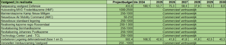 De veranderende geopolitieke situatie zorgt voor een urgente en structurele behoefte aan meer militairen, meer materieel en meer activiteiten. Dit betekent ook dat de randvoorwaarden, zoals het vastgoed, op orde moeten zijn. Het huidige vastgoed is veelal verouderd en moet worden aangepast aan de huidige normen en aan de groeiende krijgsmacht. Defensie neemt initiatief om het realisatievermogen van de vastgoedketen structureel te vergroten en daarmee het tempo van de eerder ingezette concentratie, verduurzaming en vernieuwing van het vastgoed te verhogen (Strategisch Vastgoedplan 2022, Kamerstuk 36 124, nr. 12). Zo werkt Defensie samen met het Rijksvastgoedbedrijf en marktpartijen aan nieuwe langdurige samenwerkingsvormen om de vastgoedopgave sneller te realiseren. Hierbij wordt ingezet op zoveel mogelijk gestandaardiseerde oplossingen, waarbij als eerste concrete toepassing de standaardisatie van legeringsgebouwen is uitgewerkt. Bij deze ontwikkeling hoort industrieel bouwen van gebouwen, wat zorgt voor snellere realisatie op locatie omdat de productie in de fabriek en de voorbereiding op locatie kunnen worden losgekoppeld. De ingebruikname van de eerste nieuwe legeringsgebouwen die op basis hiervan worden gerealiseerd, is voorzien in het najaar van 2026. Uw Kamer is hierover eerder geïnformeerd (Kamerstuk 36 592, nr. 13).