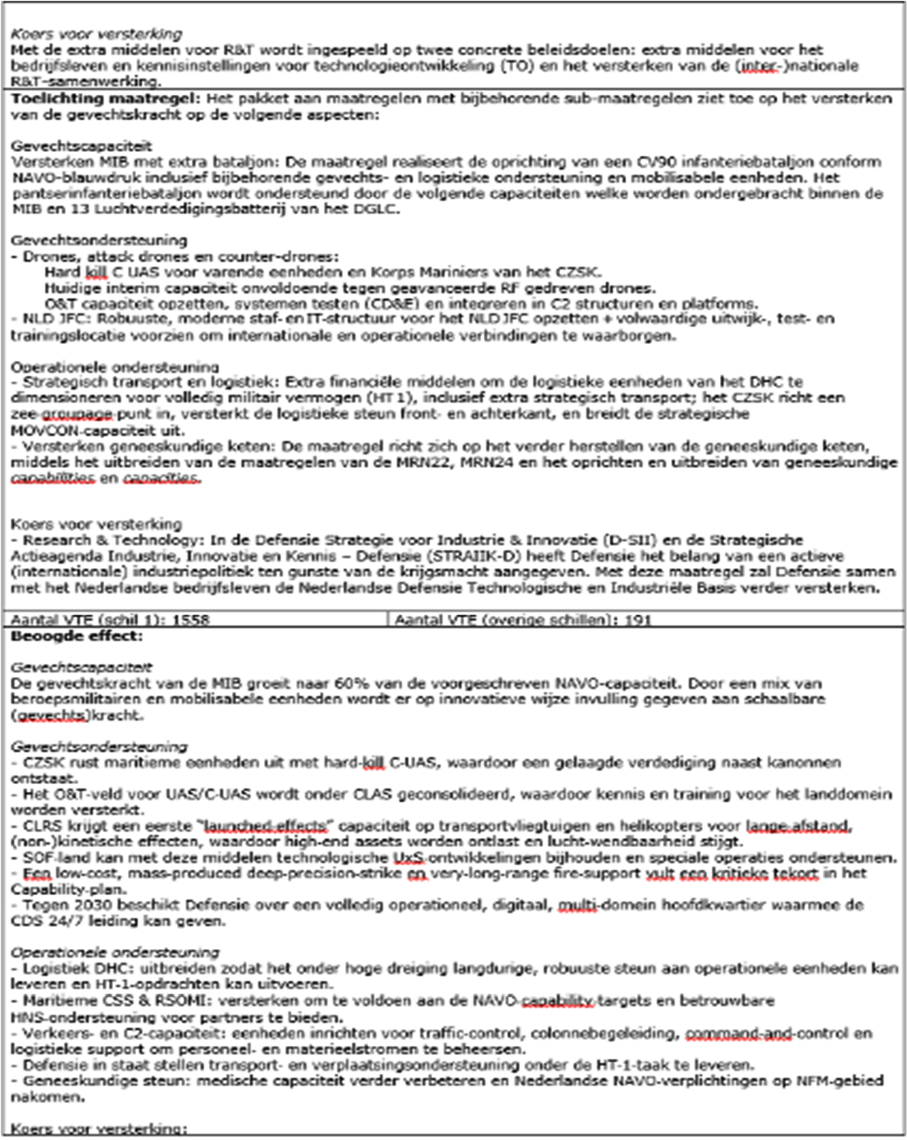 Middels de NvW wordt de kamer geïnformeerd over de beleidskeuzes gevechtscapaciteit, gevechtsondersteuning, operationele ondersteuning en koers voor versterking.