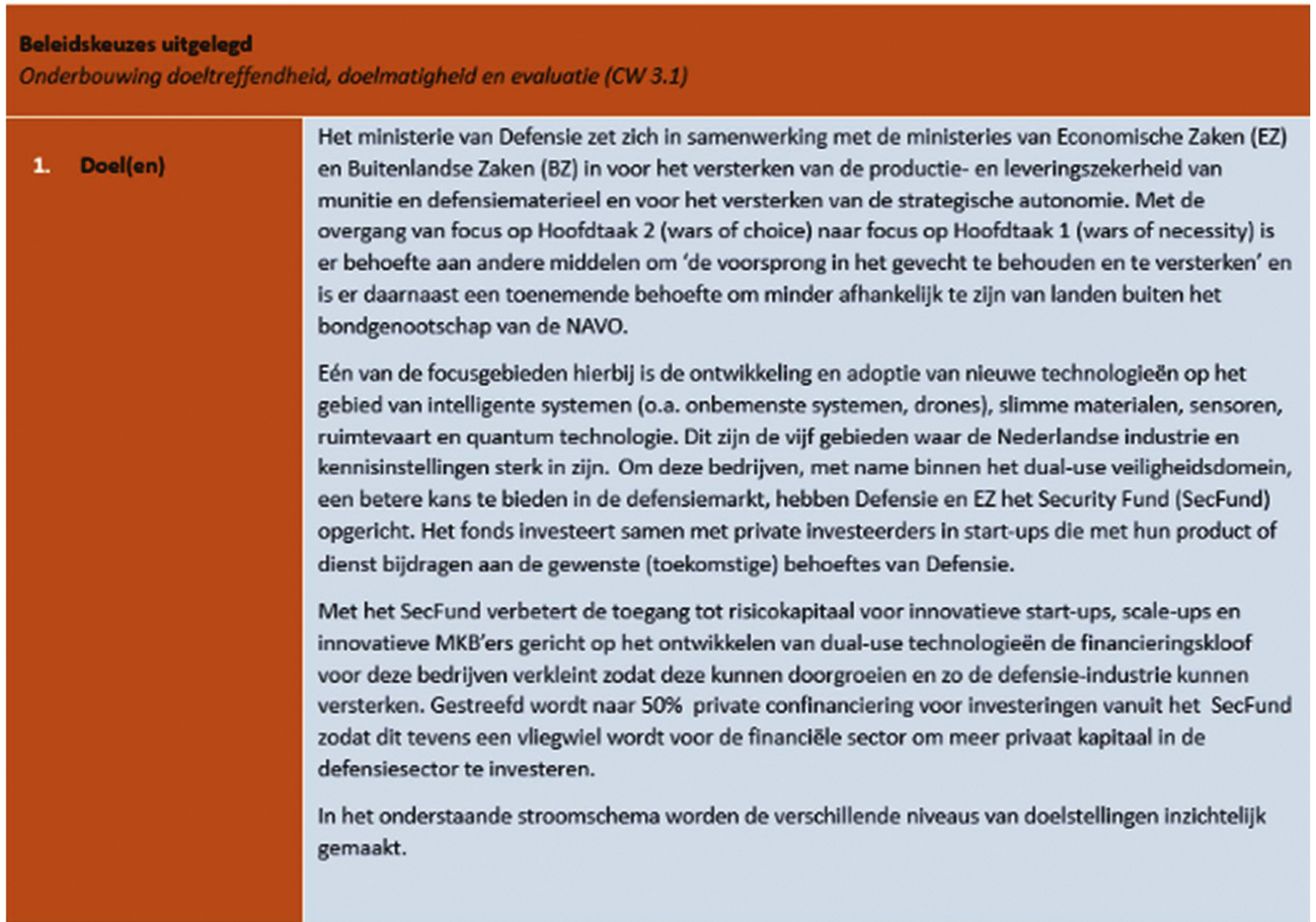 Artikel 3.1 van de Comptabiliteitswet (CW 2016) verplicht de regering om in beleidsvoorstellen duidelijke informatie te geven over de nagestreefde doelen, ingezette instrumenten, financiële gevolgen en de verwachte doeltreffendheid en doelmatigheid.