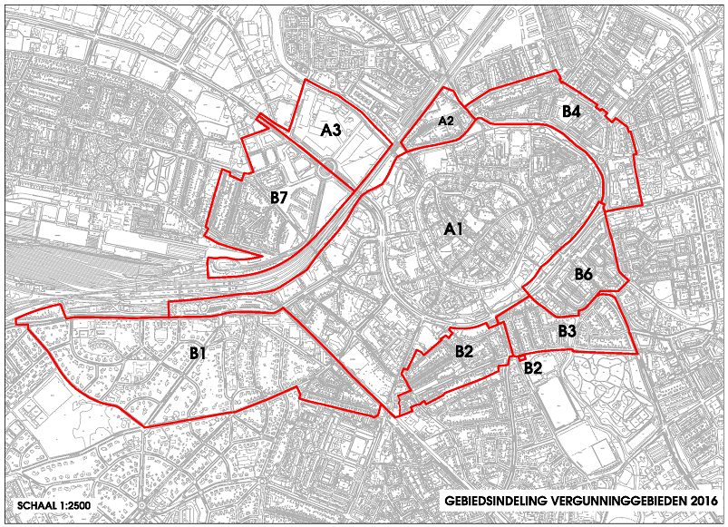 het gebied omringd door de Stadsring, H. van Viandenstraat, Bisschopsweg tussen de Hendrik van Viandenstraat en Arnhemseweg (daarbij inbegrepen Zandgat), Weistraat, Veldstraat, Arnhemseweg tussen Veldstraat en Prinses Julianaplein, Prinses Julianaplein (oostkant tussen Aldegondestraat en Lange Beekstraat), Lange Beekstraat 12 t/m 66 (even), Korte Beekstraat, gebouwencomplex de Soeverein, Arnhemseweg (tussen Julianaplein en Stadsring. En verder Kroontjesmolen, Burgerbuurt en het parkeerterrein met ingang aan de Rubensstraat (tegenover Bisschopsweg 144) als vergunninggebied B2;