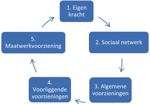 Uitgangspunt is dat iedere burger eerst kijkt wat hij zelf kan doen, wat zijn sociale omgeving voor hem kan doen of wat hij zelf voor een ander kan doen.