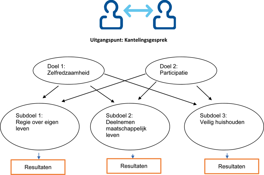Om het mogelijk te maken resultaten te omschrijven en deze te koppelen aan de bovengenoemde doelen is besloten om te werken met subdoelen. Deze subdoelen zijn gerelateerd aan de ‘einddoelen’ (zelfredzaamheid en participatie) en dienen ter communicatie met de zorgaanbieder. Er wordt verschil gemaakt tussen 3 subdoelen: