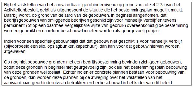 Er mogen in beginsel géén nieuwe standaard geurgevoelige objecten (type 1) en minder gevoelige objecten (type 2) worden geprojecteerd in een gebied gelegen binnen een geurcontour die een hedonische waarde van H=-2 overschrijdt. In gevallen waarin de H=-2 contour wordt overschreden geldt dat ruimtelijke ontwikkelingen slechts mogelijk zijn indien uit motivering blijkt dat direct of op termijn er sprake is of zal zijn van - alle relevante woon- en leef-aspecten in aanmerking nemende - een leefomgeving met voldoende kwaliteit.