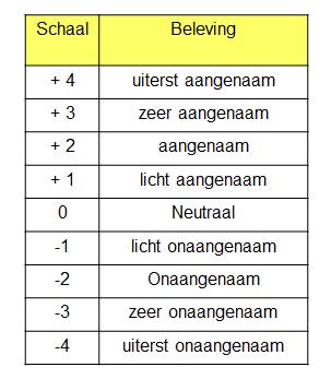 Deze wordt uitgedrukt op een schaal van H = -4 (uiterst onaangenaam) tot H = +4 (uiterst aangenaam) (bepaling van de hedonische waarde NVN 2818).