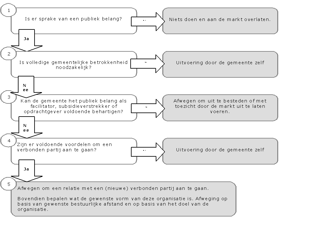 Wanneer het gemeentebestuur van oordeel is dat er géén sprake is van een publiek belang, zou de gemeente dit aan de markt of aan andere overheden over moeten laten. Als de gemeente wel een rol heeft, volgt de vraag in welke mate en vorm de gemeente betrokken moet zijn.