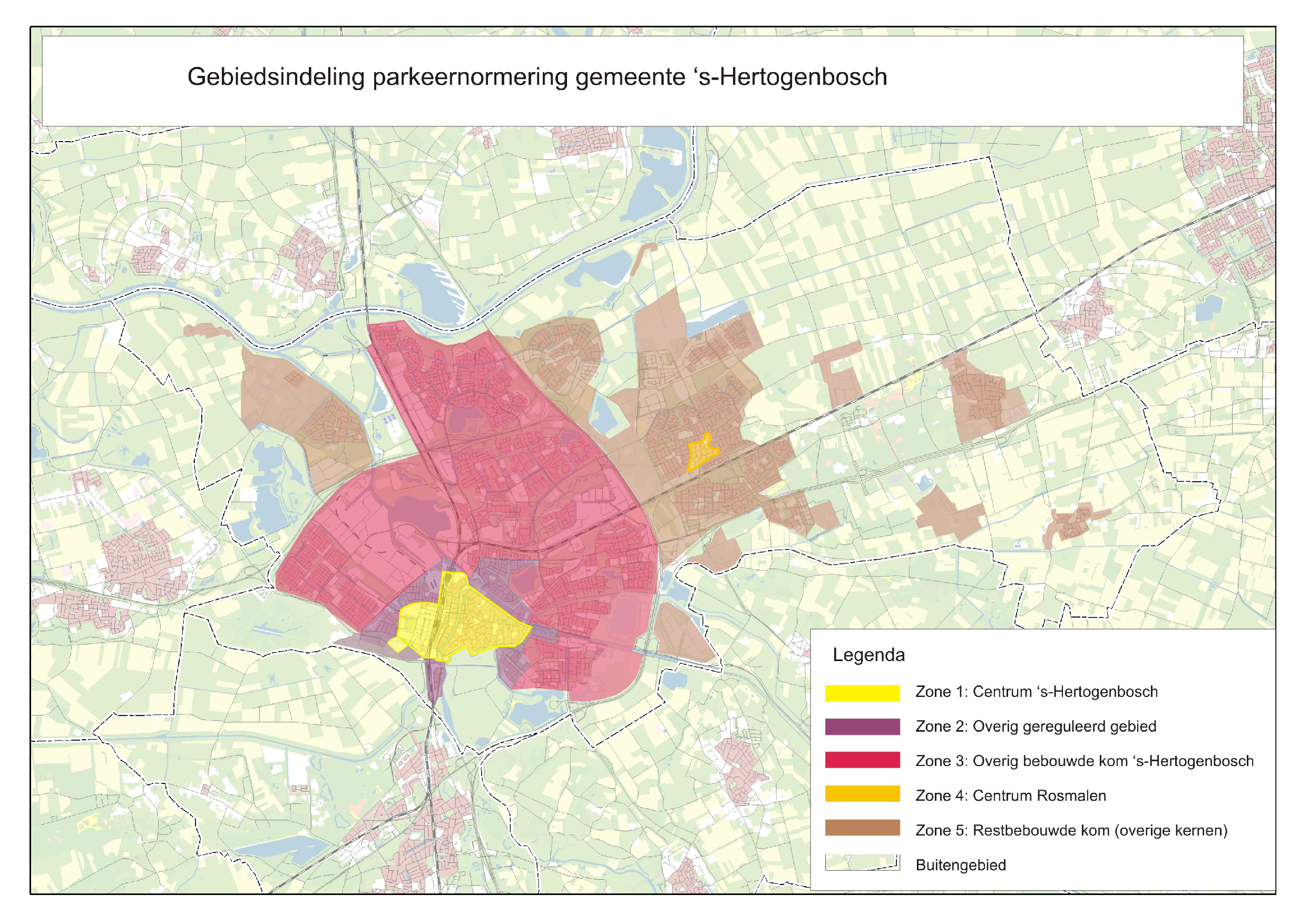 Binnen ’s-Hertogenbosch zijn verschillende gebieden te onderscheiden waarbinnen een ander autobezit, autogebruik, fietsgebruik en OV-bereikbaarheid geldt. Deze verschillen uiten zich ook in verschillen in parkeerbehoefte. Als gevolg hiervan worden binnen de verschillende gebieden andere parkeernormen en richtlijnen gehanteerd.