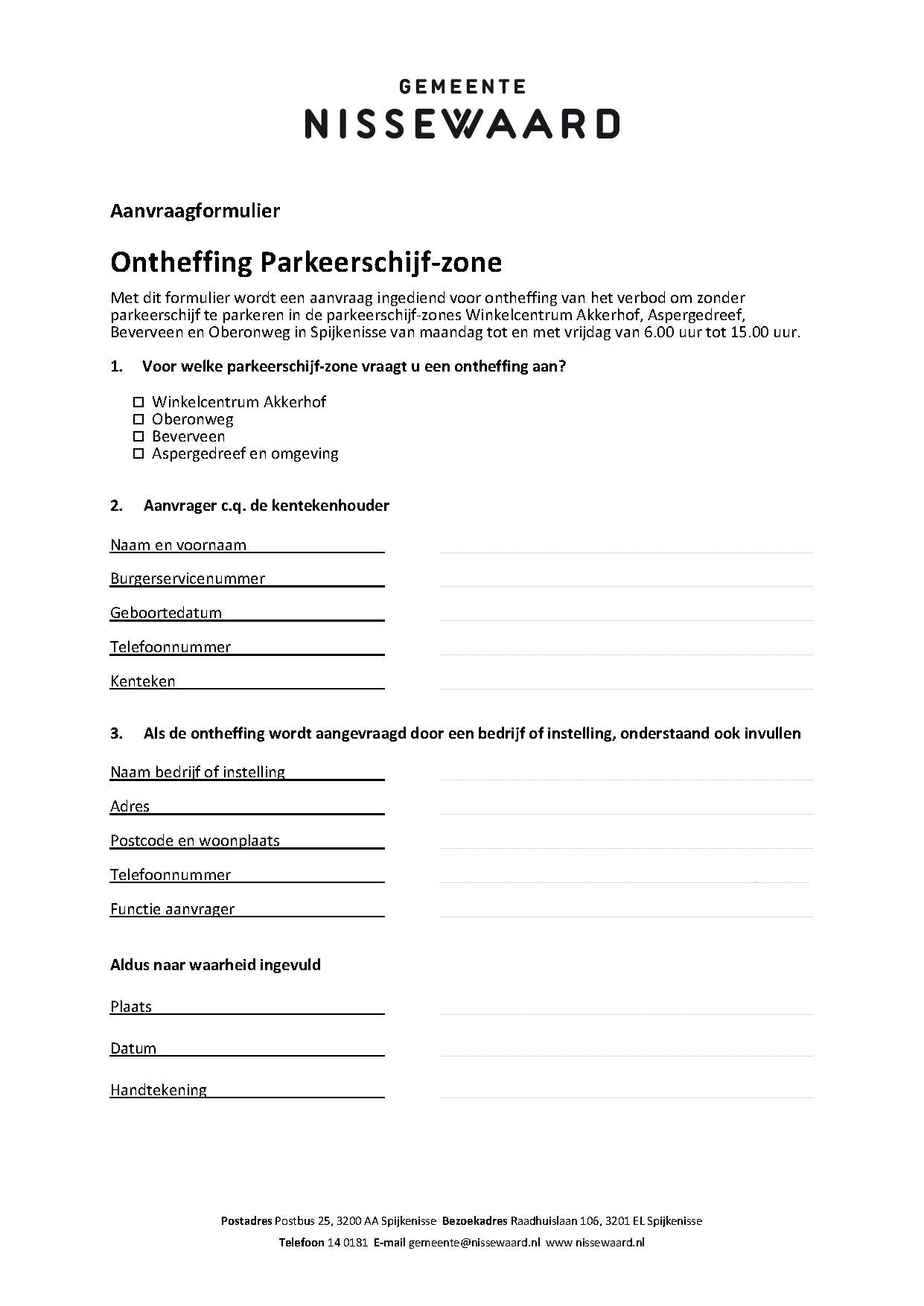 Gemeente Nissewaard - Beleidsregels ontheffing parkeerverbod parkeerschijf-zone Akkerhof, Aspergedreef, Beverveen en Oberonweg te Spijkenisse