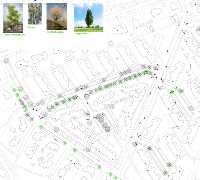 Herplant met 16 haagbeuken (Carpinus betulus ‘Frans Fontaine’) aan den Dam. Herplant met 1 valse christusdoorn (Gleditsia triacanthos ‘Sunburst’) en 3 krentenboompjes (Amelanchier arborea ‘Robin Hill’) aan de Dorth plantmaat 14-16.