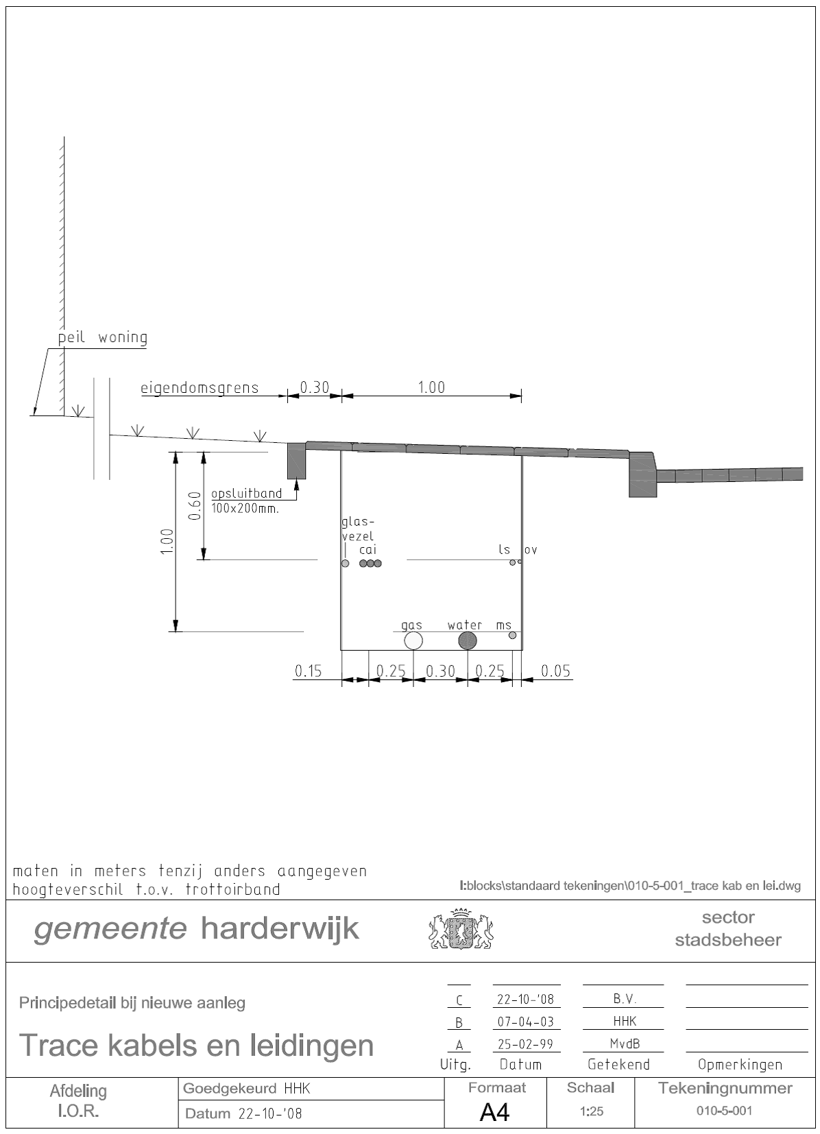 In het trottoir, zonder bomen en gerekend vanaf erfgrens/gevel, worden de kabels en/of leidingen volgens een vaste volgorde ingedeeld. Deze volgorde verschilt per straat en is in bijlage 1 weergegeven.