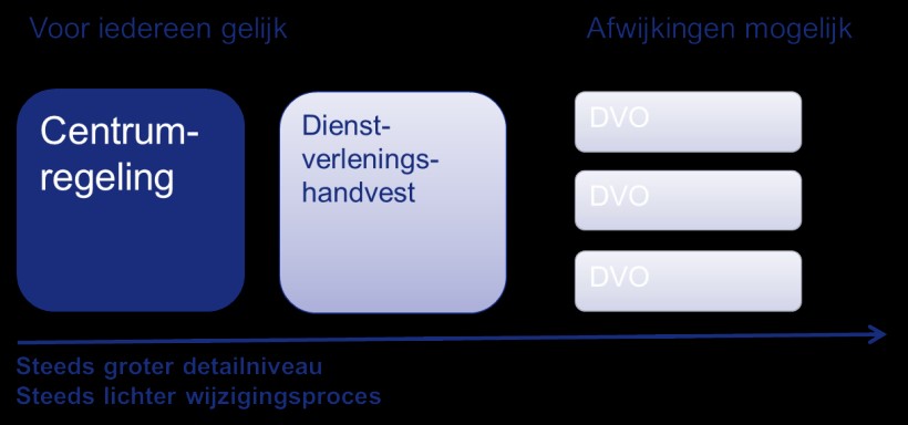 De verhouding tussen centrumregeling, dienstverleningshandvest en dienstverleningsovereenkomsten is in onderstaande afbeelding weergegeven.