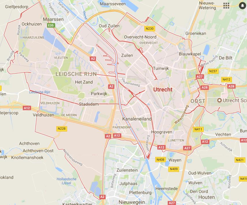 het grondgebied van de gemeente Utrecht dat is gelegen ten oosten van het Amsterdam-Rijnkanaal (begrensd door de Slotlaan, Gageldijk, A27, A28, Bunnikseweg, Tolakkerlaan, Rijnsoever, Zandoever, Weg naar Rhijnauwen, A27 en A12) met uitzondering van het stationsgebied Utrecht CS, als bedoeld in de bijlage die is vastgesteld krachtens artikel 3, eerste lid van het Besluit opsporing terroristische misdrijven, aan te wijzen als veiligheidsrisicogebied (zie bijlage met kaart behorende bij dit besluit);
