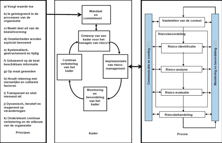 Uit verschillende intern gehouden sessies blijkt dat in onze organisatie op verschillende niveaus, in verschillende organisatieonderdelen op verschillende manieren omgegaan wordt met risicomanagement. Het doel is om met de keuze voor één risicomanagementmethode een eenduidige werkwijze en een eenduidig niveau binnen de gehele organisatie verder te bevorderen. Meer uniformiteit in een systematisch en transparant proces maakt het mogelijk om organisatiebreed risico’s beter inzichtelijk te maken en afweging te maken in het beheersen of aangaan van risico’s. Er zijn verschillende risicomanagementmethodes die in de kern dezelfde processtappen bevatten (bepalen kader, bepalen context, identificeren, analyse, beoordeling, behandeling, evaluatie). Bij het bepalen van de risicomanagementmethode hebben we als uitgangspunt genomen dat de methodes die al toegepast worden in onze organisatie hiermee in lijn liggen en dat de methode een compleet beeld geeft van het speelveld van risicomanagement. Er is gekozen voor ISO 31000 Risicomanagement-Principes en richtlijnen[1]. In deze norm worden principes beschreven waaraan moet worden voldaan wil er sprake zijn van doeltreffende risicomanagement. In de norm wordt aanbevolen dat een organisatie een kader ontwikkelt (voorliggende notitie), implementeert en continu verbetert. Dit kader heeft tot doel het proces van risicomanagement te integreren in het algemene bestuur, de strategie en planning, het management, de rapportageprocessen, beleids(lijnen), waarden en cultuur van de organisatie. Tevens wordt het proces van risicomanagement uiteengezet. De uitgangspunten van deze norm sluiten goed aan bij ons doel om uniformiteit en transparantie te bevorderen. Figuur 1 geeft de hoofdlijnen van ISO 31000 aan.