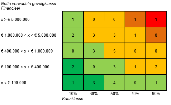 Het gevolg en de kans tezamen resulteren in een risicoscore. De risicoscore wordt berekend door de rekensom kansklasse plus gevolgklasse. Alle risicoscores kunnen op een risicokaart inzichtelijk gemaakt worden, zodat de spreiding van de risico’s naar kans een gevolg in één oogopslag inzichtelijk is. Een voorbeeld van de risicokaart is onderstaand weergegeven. De getallen per hokje geven aan hoeveel risico’s er zijn met die risicoscore. Onderstaand is een fictief voorbeeld opgenomen van een ingevulde risicokaart. In dit fictieve voorbeeld is in de categorie met een kansklasse 90% en gevolgklasse > € 5 miljoen dus 1 risico aanwezig.