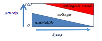 Bij initiële besluitvorming in de vorm van een raadsvoorstel worden risico’s anders dan uitgedrukt in financiële middelen, benoemd bij een gevolgklasse vanaf 4 aangevuld met de risico’s met een gevolgklasse 3 met een kansklasse 4 of 5. De borging van deze activiteit is belegd in het ontwikkeltraject verbetering voorbereidende besluitvormingsproces.