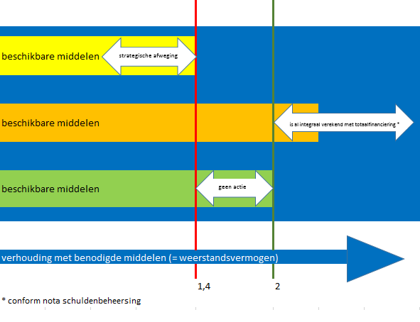 Volgens de bovenstaande tabel een beoordeling van Ruim voldoende. Indien het weerstandvermogen onder de 1,4 komt, maakt het college een strategische afweging of ingrijpen noodzakelijk is. Dit wordt weergegeven in de volgende figuur.