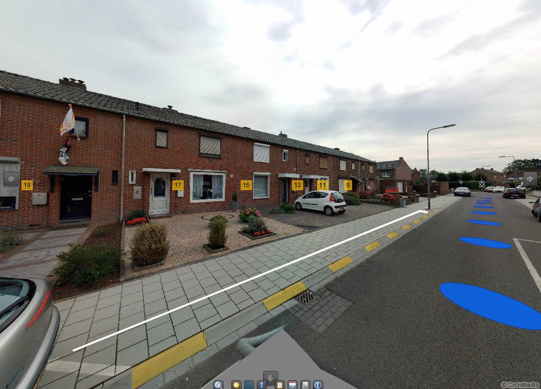 Verwijderen van de gele onderbroken markering voor de huisnummers 13,15 en 17.