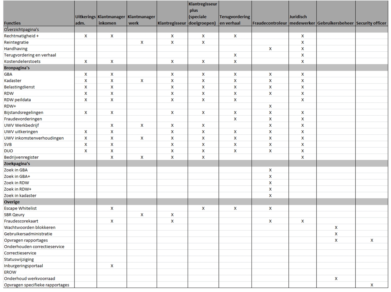 De autorisatiematrix1 is per 1-7-2017 herzien. Hierin is opgenomen dat de medewerker enkel de voor hem/haar van belang zijnde gegevens kan raadplegen. Zo kan de uitvoerder van terugvordering en verhaal specifiek raadplegen bij onderzoeken die samenhangen met vorderingen of met verhaal op onderhoudsplichtigen. Dit bijvoorbeeld ter vaststelling van de woonplaats, de draagkracht, het inkomen of de werkgever.