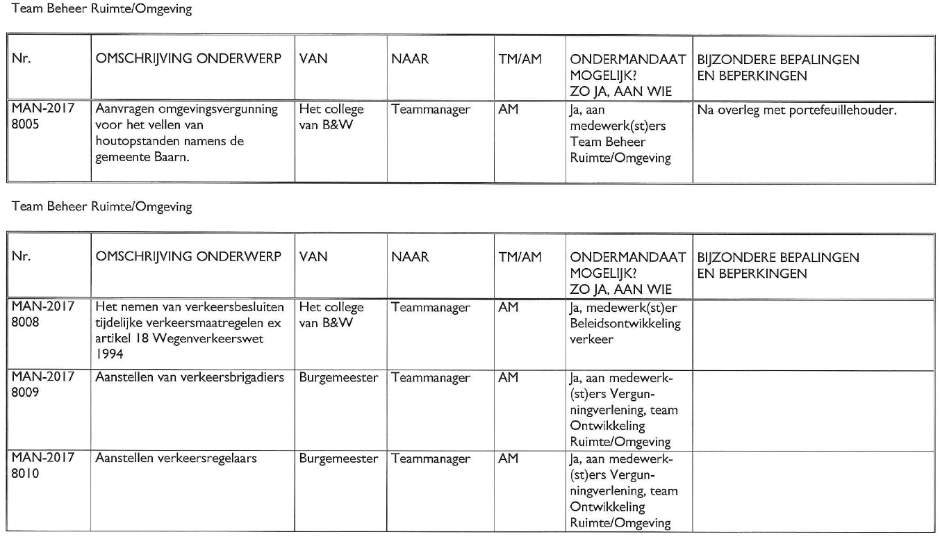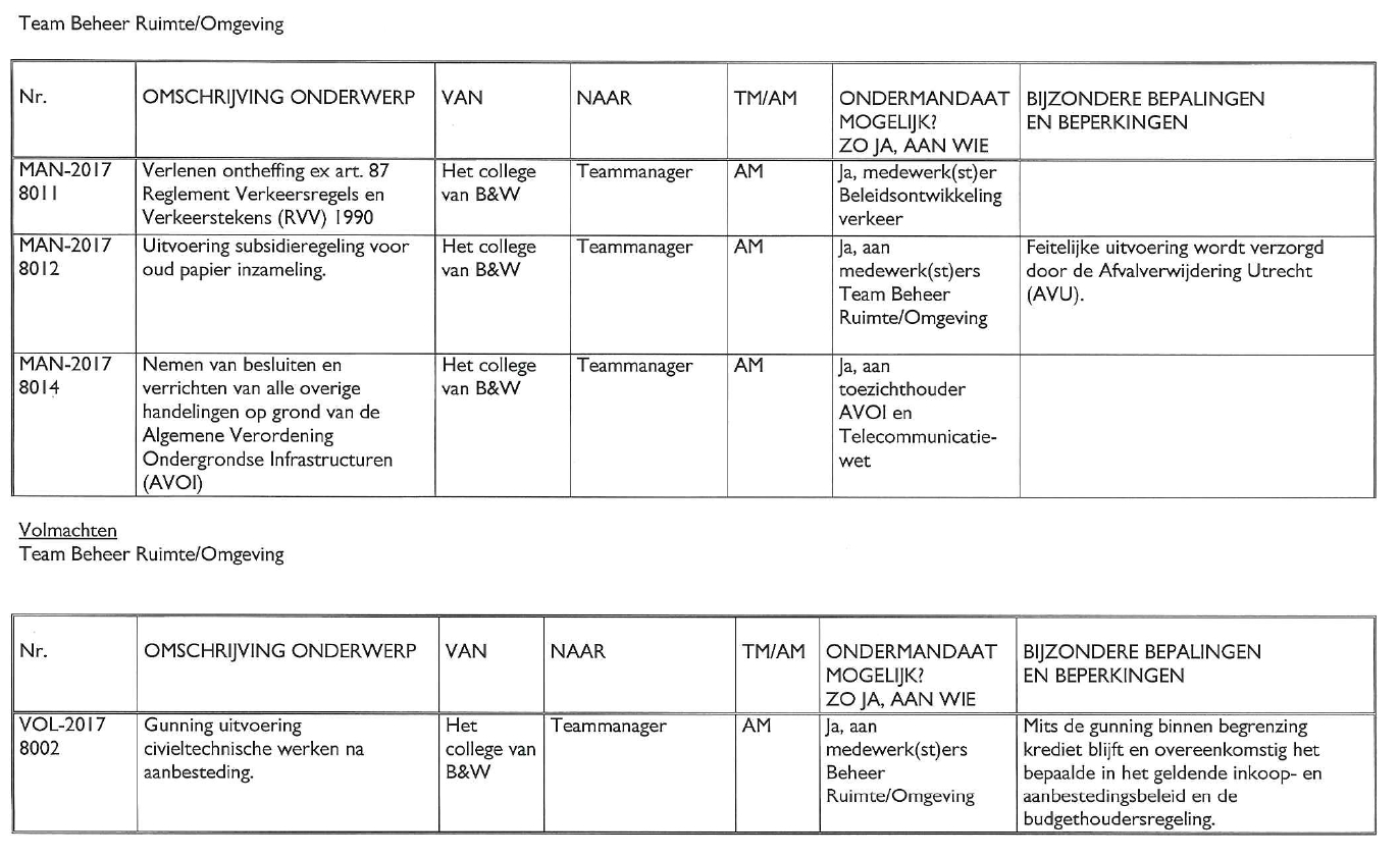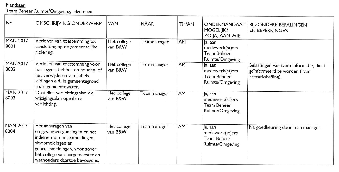 De Strategisch manager Ruimte/Omgeving besluit tot het verlenen van ondermandaat zoals omschreven in de volgende tabellen: