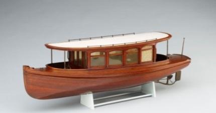 Het vaartuig gebruikt passende materialen als hout, staal, zeildoek en glas.