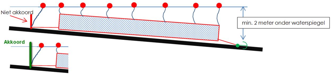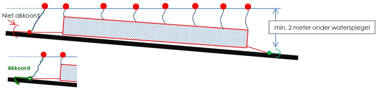 Onderstaande tekening is bedoeld om te verduidelijken waarom bepaalde typen verankering niet zijn toegestaan. Het gaat in dit voorbeeld om een paaltje dat “onzichtbaar” onder de waterlijn staat en om een anker waarbij één of meer vloeien uit het zand omhoog steken.
