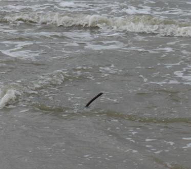 Foto uit de praktijk: de vloei van een stokanker van een staand want op het strand van Schagen. Bij hoog water niet zichtbaar en een potentieel gevaar voor andere gebruikers van het strand.