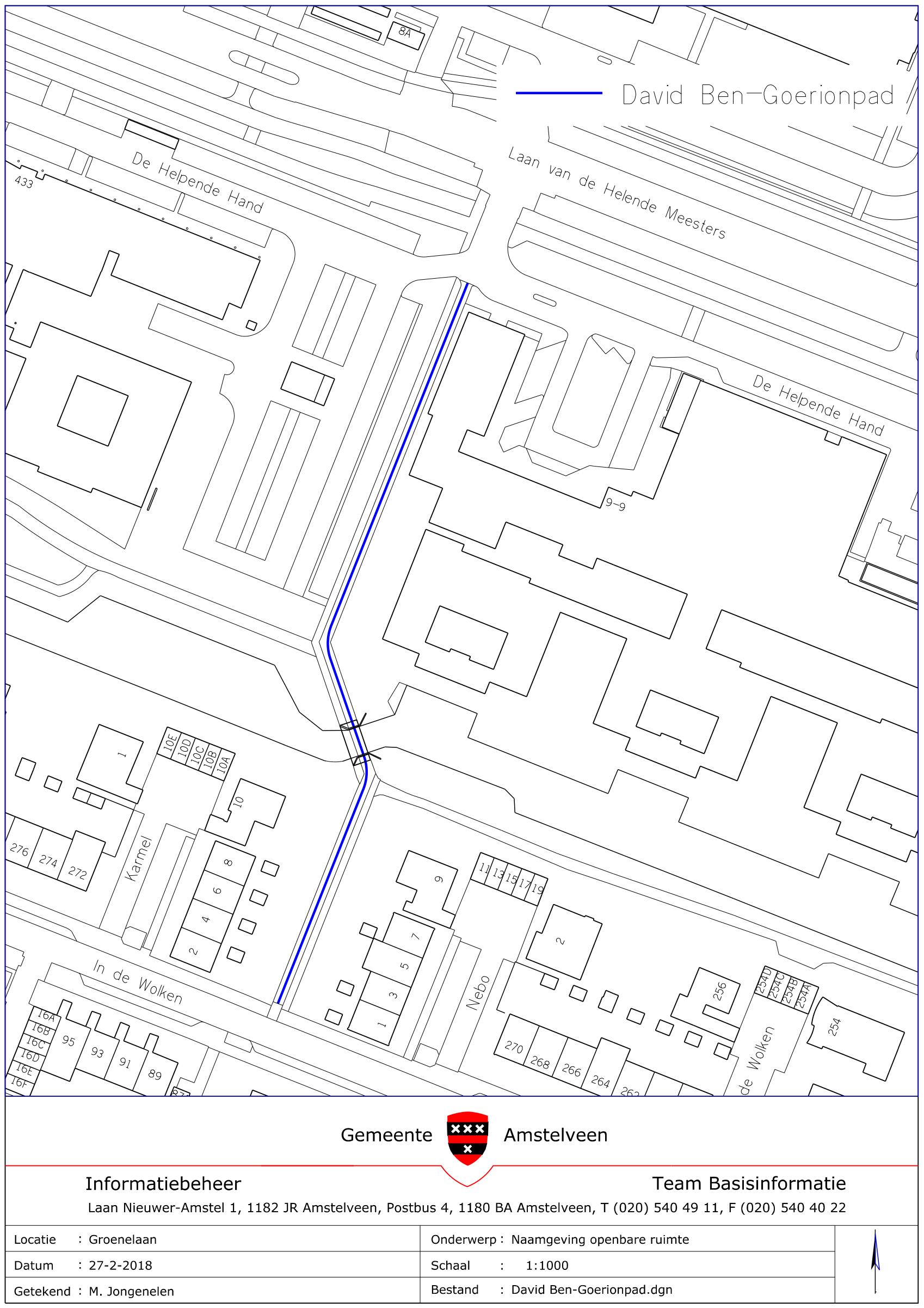 Vanuit het bestuur is verzocht om op korte termijn een straatnaam te vernoemen naar David BenGoerion. Op dit moment zijn er geen nieuwe straten beschikbaar om vernoemd te worden. De Schegis niet opportuun omdat niet op korte termijn een straat wordt aangelegd. Daarnaast is voor de straat-namen in de Scheg gekozen voor een thema, nl. bekende Amstelveners, waarvoor al meer namen naarvoren zijn gebracht dan er straten zijn. Daarom wordt voorgesteld om het fietspad tussen de HelpendeHand en in de Wolken te vernoemen. Dit ligt in de nabijheid van het ziekenhuis met een grote Joodseafdeling en van straten met Israëlische bergen (Karmel, Nebo).