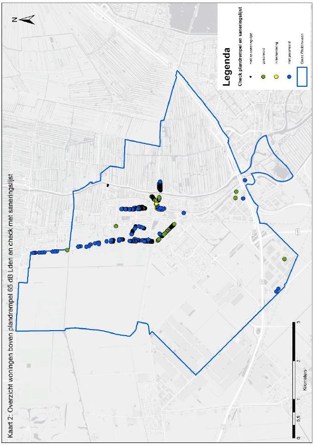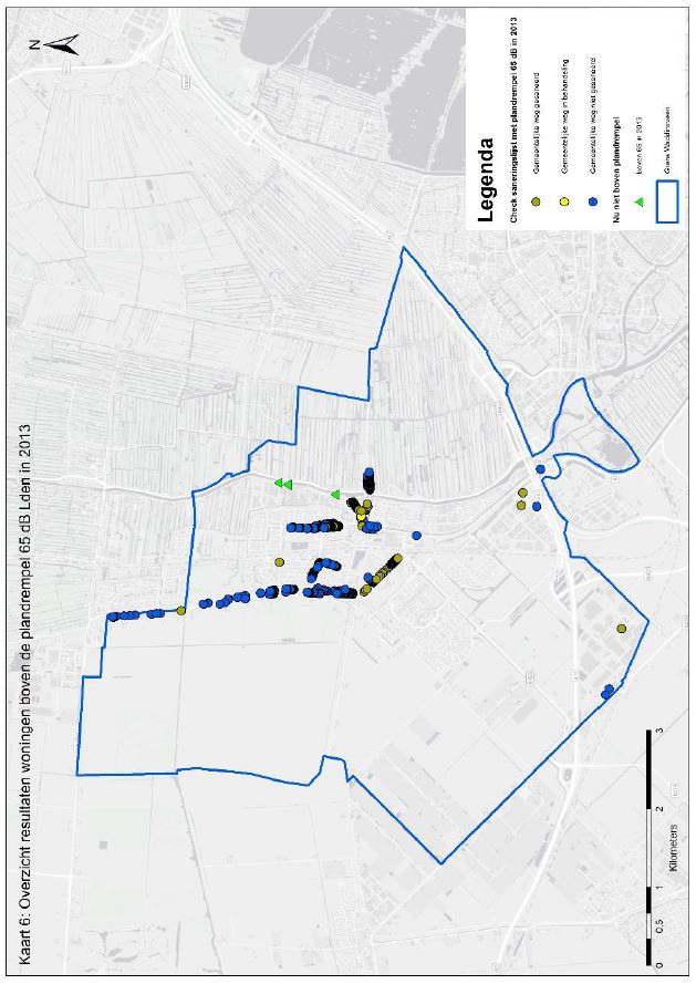 In figuur 6 in bijlage 2 is een overzicht gegeven van de ligging van de woningen waarop de geluidsbelasting in 2013 hoger was dan de plandrempel van 65 dB Lden.