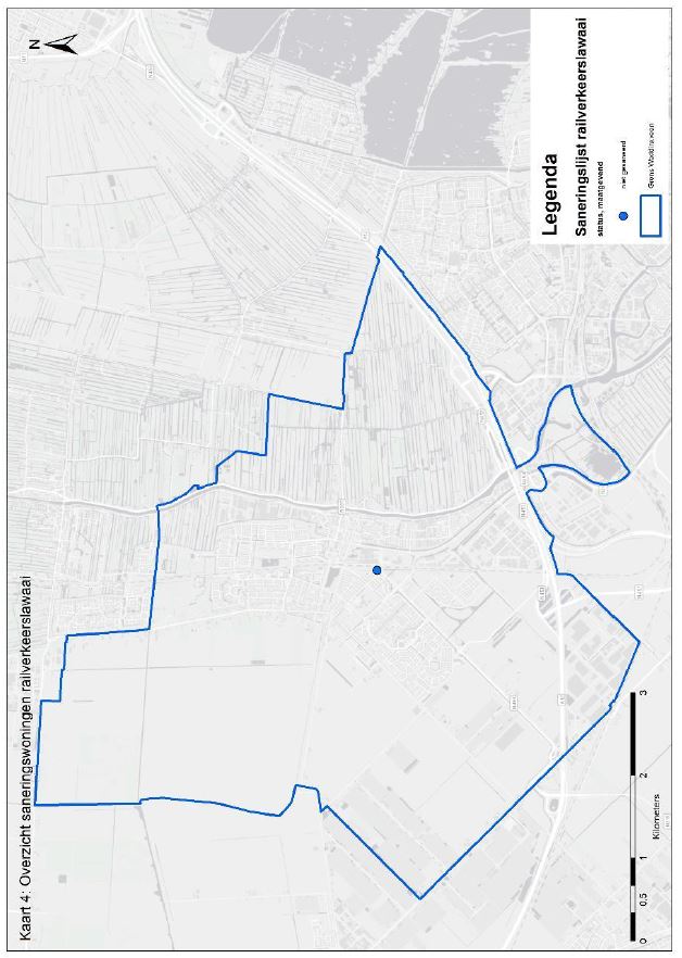 Kaart 4 in bijlage 2 geeft een overzicht van de saneringswoningen railverkeerslawaai. In tabel 10 is een overzicht gegeven van de saneringsopgave railverkeerslawaai.