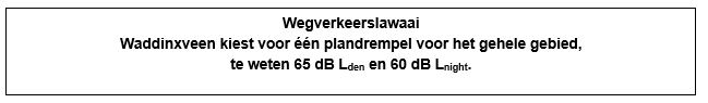 De gemeente Waddinxveen heeft gekozen voor een plandrempel van 65 dB Lden en 60 dB Lnight voor wegverkeerslawaai. Tabel 8 geeft een overzicht van de 17 woningen aan lokale wegen waarvoor de geluidsbelasting boven de plandrempel van 65 dB Lden en respectievelijk 60 dB Lnight ligt.