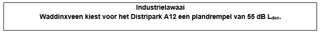 In Waddinxveen is voor het Distripark Doelwijk een geluidsbeheersplan vastgesteld. Met de bedrijven op dit park zijn afspraken gemaakt over de hoeveelheid geluid die deze mogen produceren. Voor de overige bedrijventerreinen in Waddinxveen zijn geen afspraken gemaakt. In totaal hebben vijf woningen een geluidsbelasting van ten hoogste 55 dB (in de klasse 55 tot 59 dB) Lden. Voor industrielawaai is in analogie met het geluidsbeheerplan alleen een plandrempel voor Lden vastgesteld.