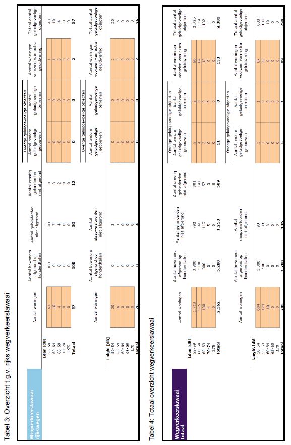 Van de drie beschouwde bronnen veroorzaakt wegverkeerslawaai de meeste hinder. Tabel 4 geeft een overzicht van het aantal woningen, bewoners en het aantal (ernstig) gehinderden en slaapverstoorden boven de 55 dB Lden en 50 dB Lnight als gevolg van alle gemeentelijke, provinciale en rijkswegen tezamen.